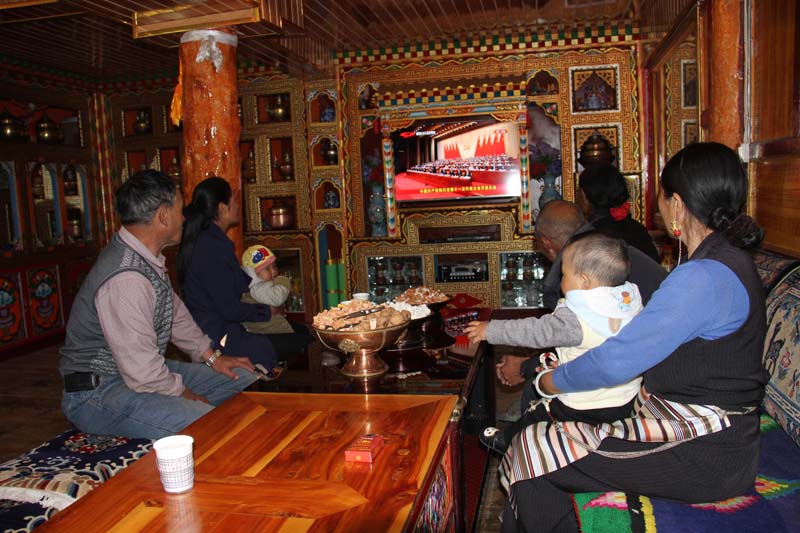 理塘县高城镇哈戈村,藏族村民健康一家人和邻居一起在家里收看党代会开幕直播。叶强平 摄