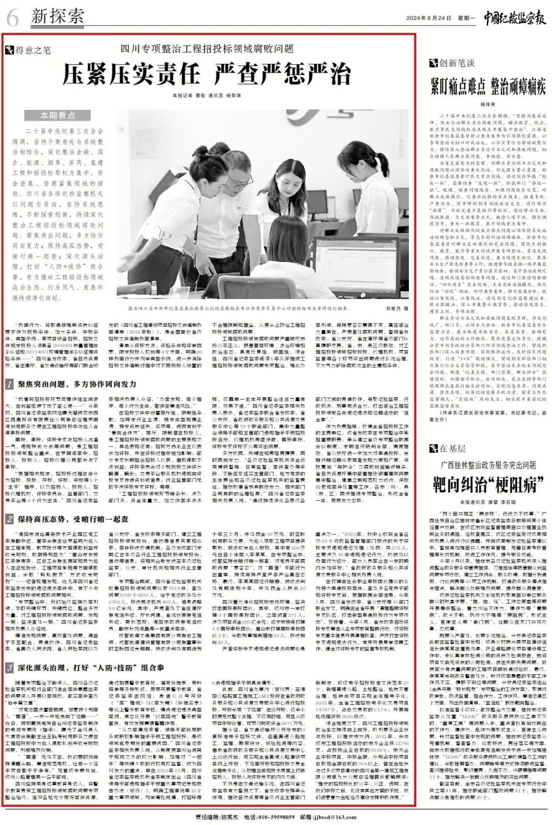 2024年6月24日,《中国纪检监察报》新探索版刊发《四川专项整治工程招投标领域腐败问题 压紧压实责任 严查严惩严治》。