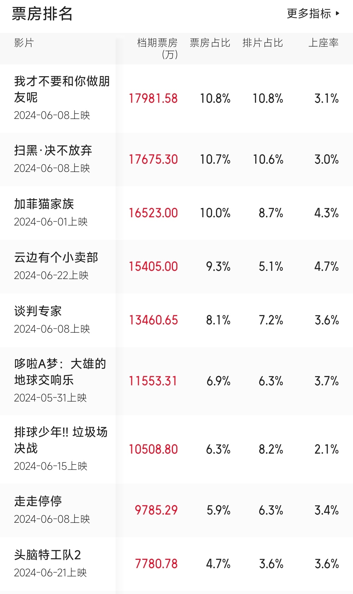根据猫眼电影的票房统计,截至6月24日12时,《加菲猫家族》《哆啦A梦:大雄的地球交响乐》《排球少年!!垃圾场决战》都进入了票房榜前十,三部电影都是引进的海外动画电影,票房都过亿元。