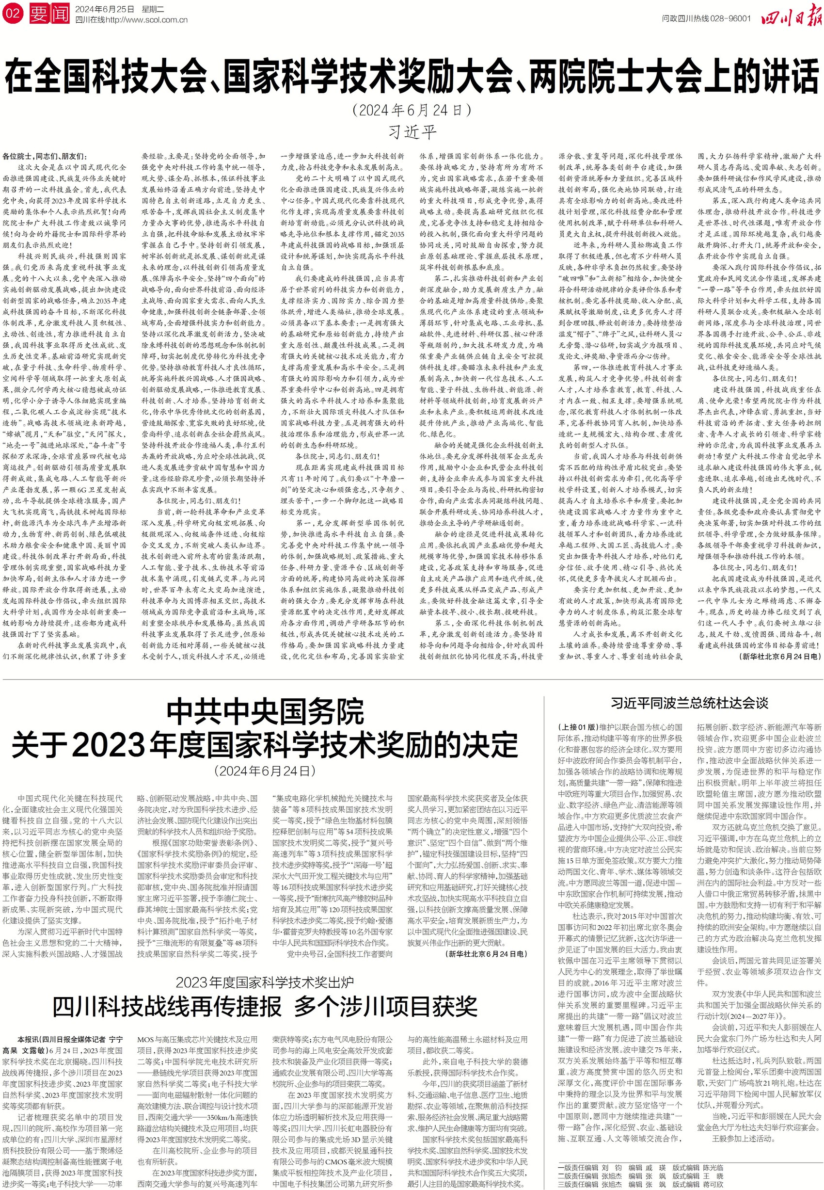 2023年度国家科学技术奖昨日出炉,共评选出250个项目和12名科技专家。多个涉川项目斩获国家科学技术进步奖、国家自然科学奖、国家技术发明奖等奖项,涵盖新材料、交通运输、电子信息、医疗卫生、地质勘探、农业等领域。今日二版,了解获奖项目“含川量”。