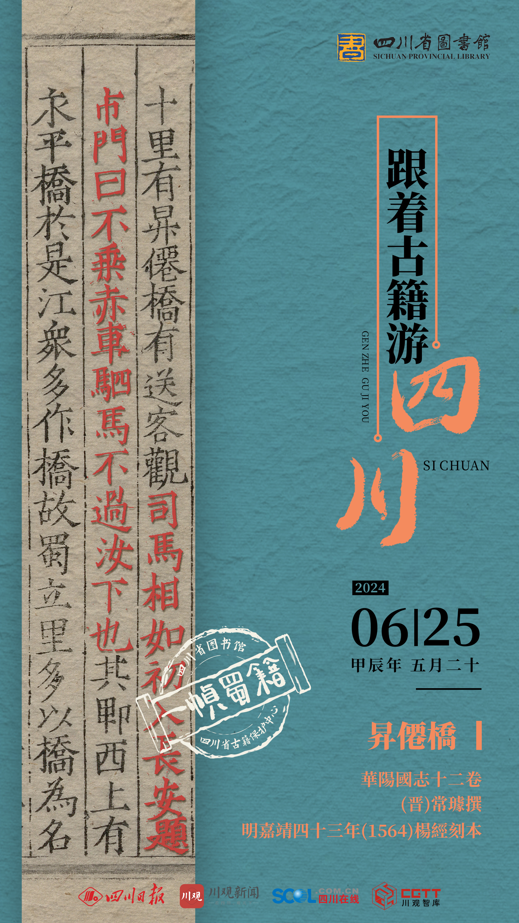 6月25日,一帧蜀籍带你云游到历史星河中的升仙桥,海报图所选用的版本为华阳国志十二卷,(晋)常璩撰,明嘉靖四十三年(公元1564年)杨经刻本。