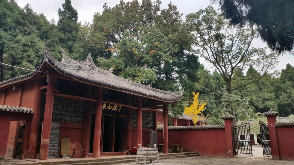 我们沿着卧龙山盘山而上,半山腰中有一座两层的楼阁,掩隐在苍翠的山林间。当地人称为孔明殿,殿前有大松柏,殿内有武侯像和孔明泉。殿联:此是武侯故垒,浩然正气联北斗;恰与乔墓对峙,奕世忠贞泽西蜀。孔明泉周围还有饮马池、拴马桩、跑马场、点将台等三国遗址,都与诸葛亮在此练兵有关。