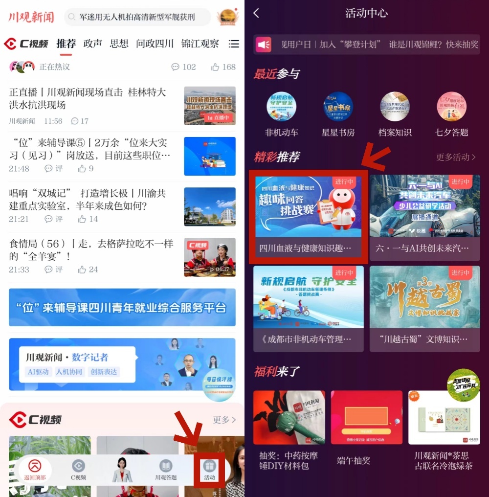 方式二:在川观新闻首页,点击“活动”,找到四川血液与健康知识趣味问答挑战赛活动图片,点击即可参与答题;
