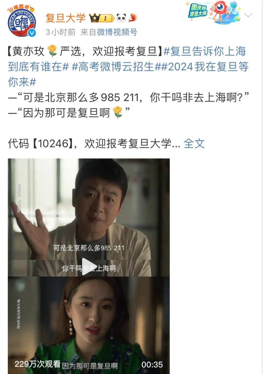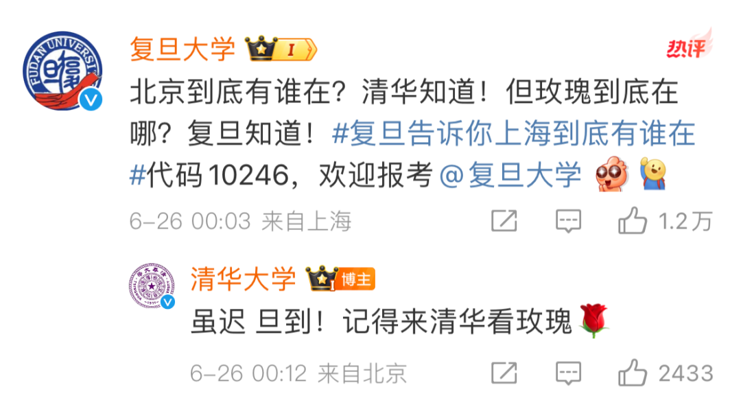 26日凌晨,复旦大学官博在该视频下留言:“北京到底有谁在?清华知道!但玫瑰到底在哪?复旦知道!复旦告诉你上海到底有谁在,代码10246,欢迎报考。”