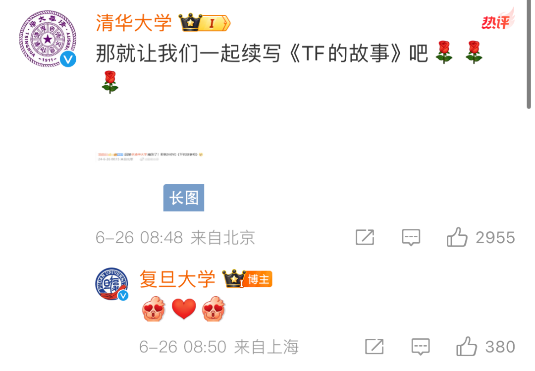 清华大学官博随后回复:“那就让我们一起续写《TF的故事》吧。”