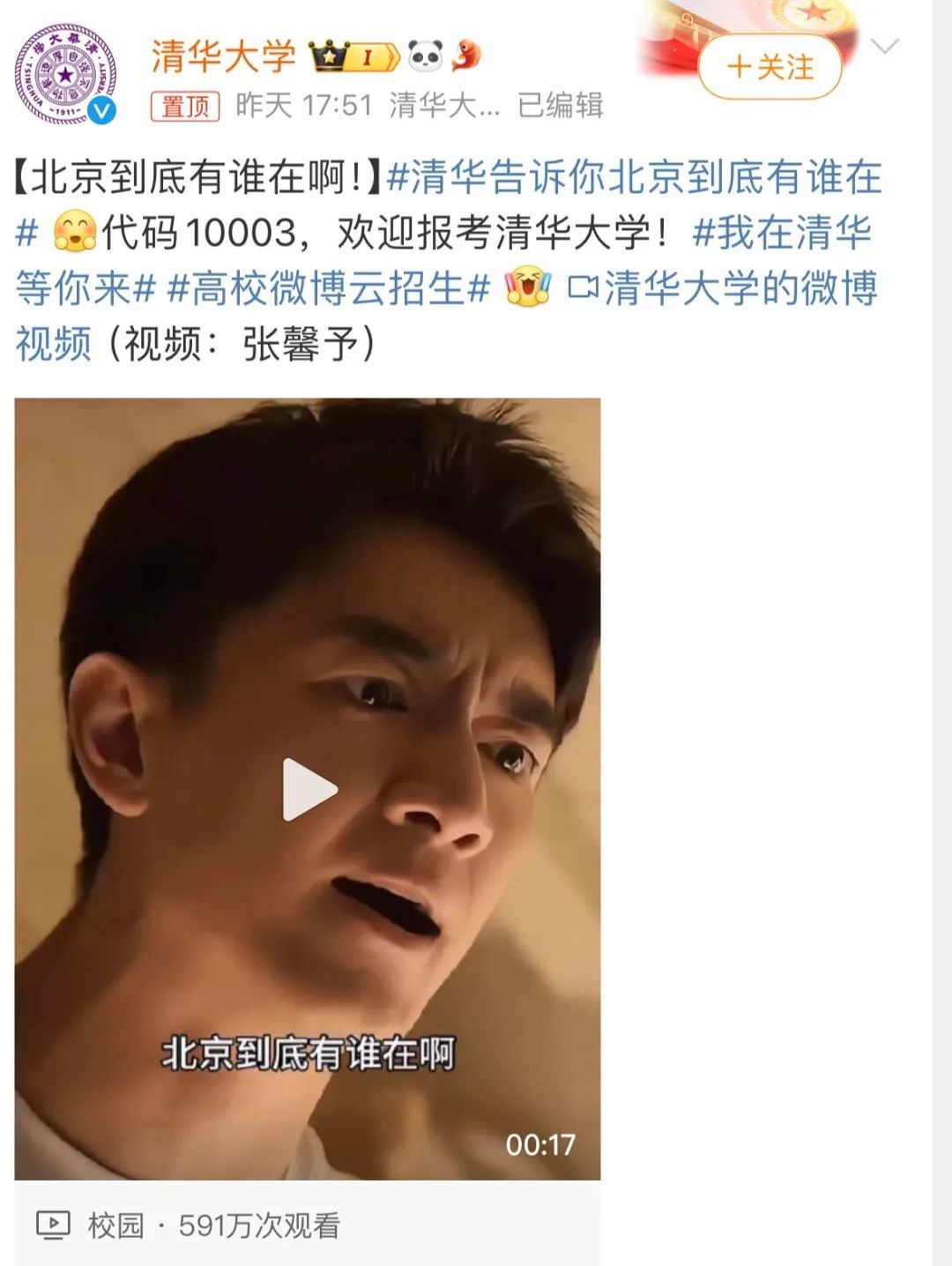 25日下午,清华大学官博发布“北京到底有谁在啊”的相关视频写道:“清华告诉你北京到底有谁在,代码10003,欢迎报考清华大学!”