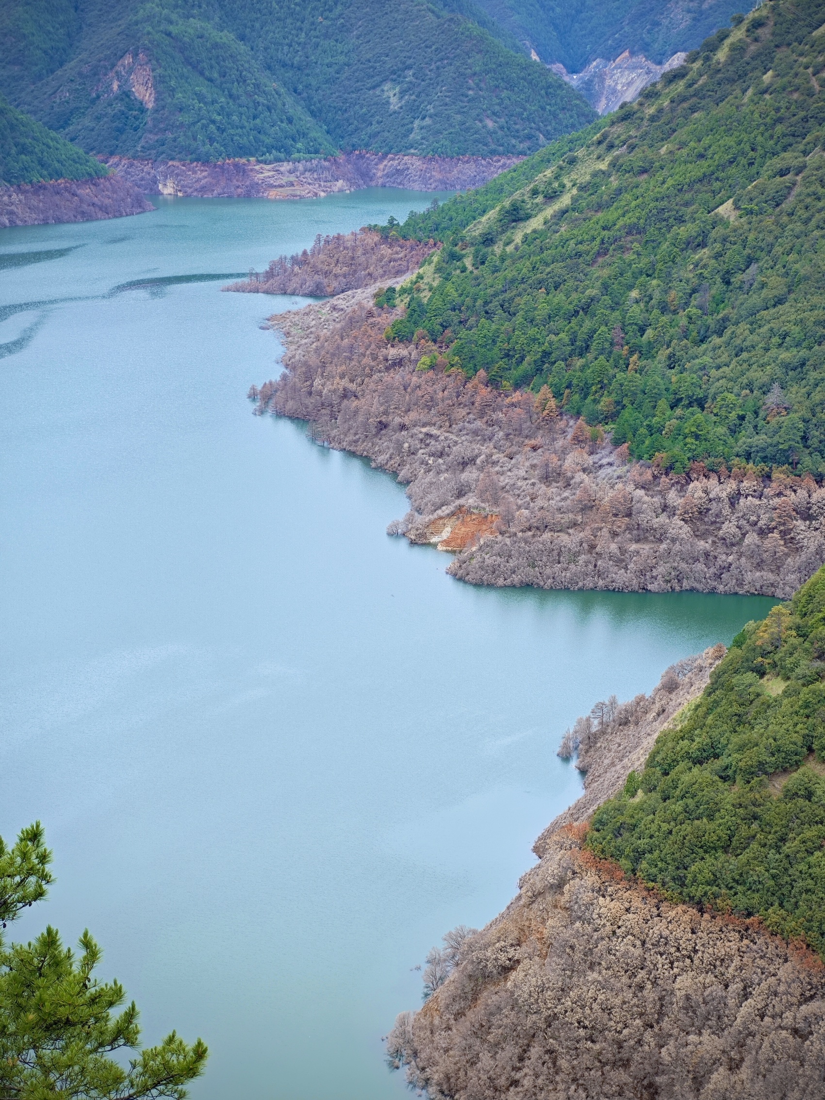 和冰川、原始森林、草甸、藏寨等318国道沿线上的常见观光地相比,天龙湖是这一公路沿线少有的与现代化工程相关联而形成的景区,有着明显差异化的旅游资源。在瘦削相对的青山之间,蜿蜒游走的湖水清澈凝碧,倒映着蓝天白云。湖面西侧还有“湖连谷”“湖中峡”“峡湖相间”的奇特山水景观,山水交错带来独特美感。在湖岸线,被高水位淹没的绿树在低水位期显露出来,枯黄的躯干和枝叶,恰似海滩的黄沙,将碧水与青山分割开来,景观层次分明。