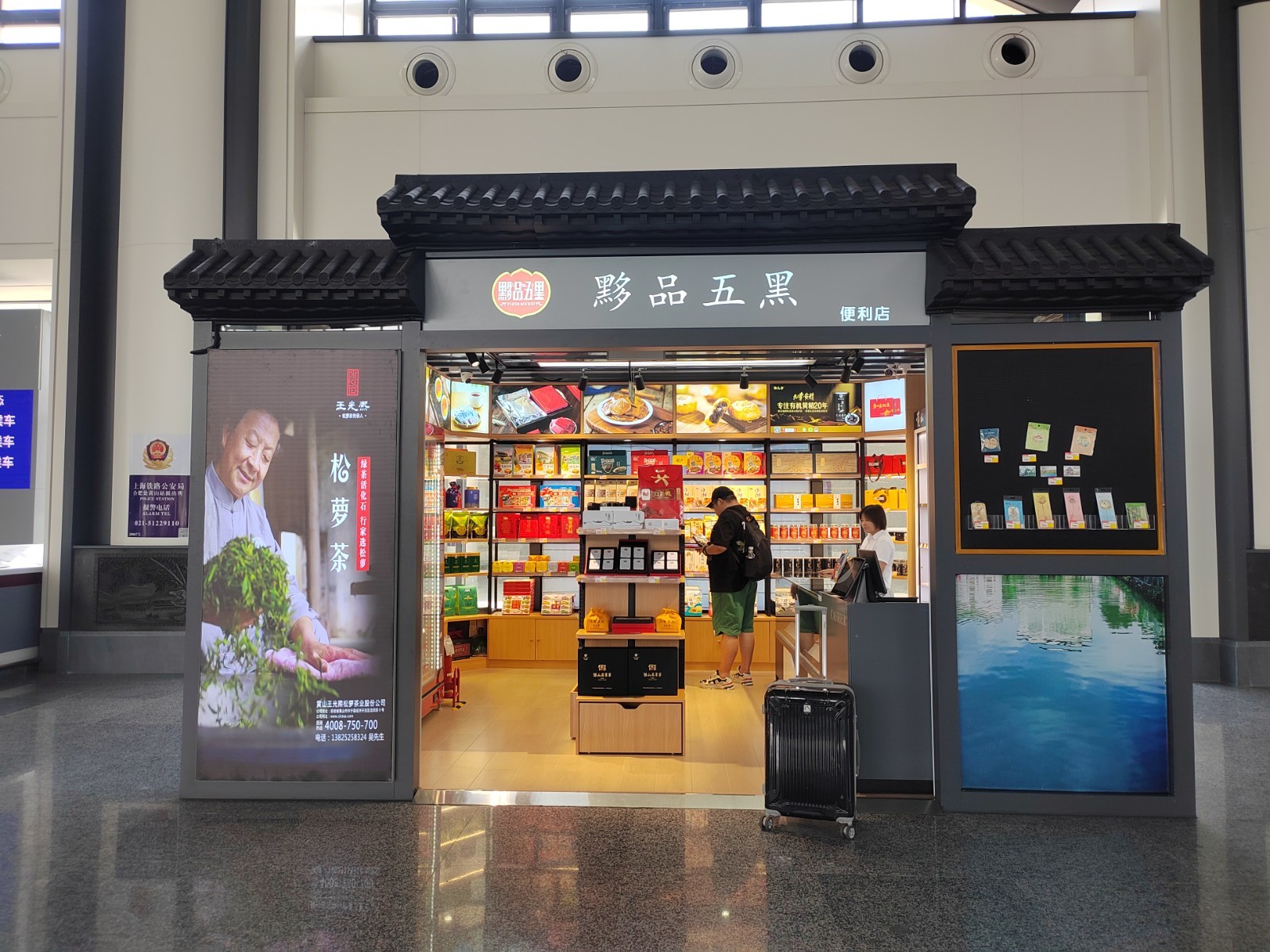 黟县东高铁站候车大厅内,有一家“黟品五黑”销售店,其仿照徽派建筑的“青砖小瓦马头墙”特点而建,店内黟县出产的黑玉米、黑茶等特产摆放整齐。