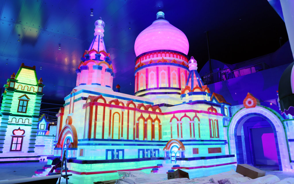 目前,哈尔滨冰雪大世界梦幻冰雪馆建设已接近尾声。梦幻冰雪馆建筑面积2.38万平方米,建有9个主题分区和13个体验项目,让游客在盛夏也可感受北方冬季冰雕景观的魅力。