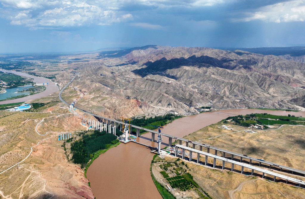宁夏中卫:沙坡头黄河公路大桥建设正酣