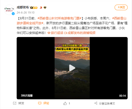 本周六,西岭雪山游步道将全线开放,新开放的步行道第二段从鸳鸯池广场至鸽子花广场,素有“植物科普长廊”之称。此外,8月31日前,西岭雪山景区针对所有游客免门票,小伙伴们可以安排起来啦!