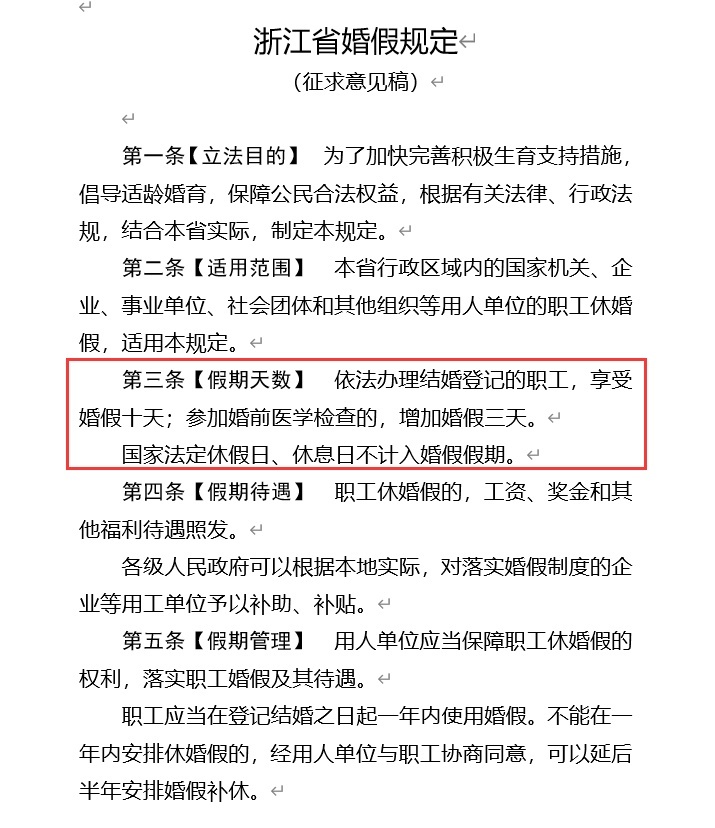 近日,社交媒体上流传着一则关于《浙江省婚假规定(征求意见稿)》的截图,其中提到“依法办理结婚登记的职工,享受婚假十天”。