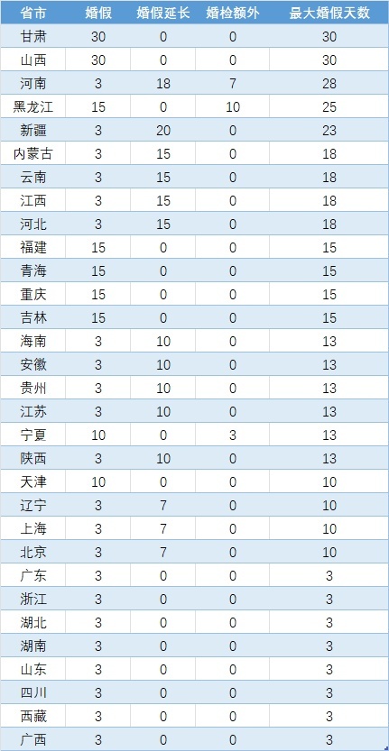 可以注意到,最多的省份婚假天数可以达到30天,普遍都在15天左右。