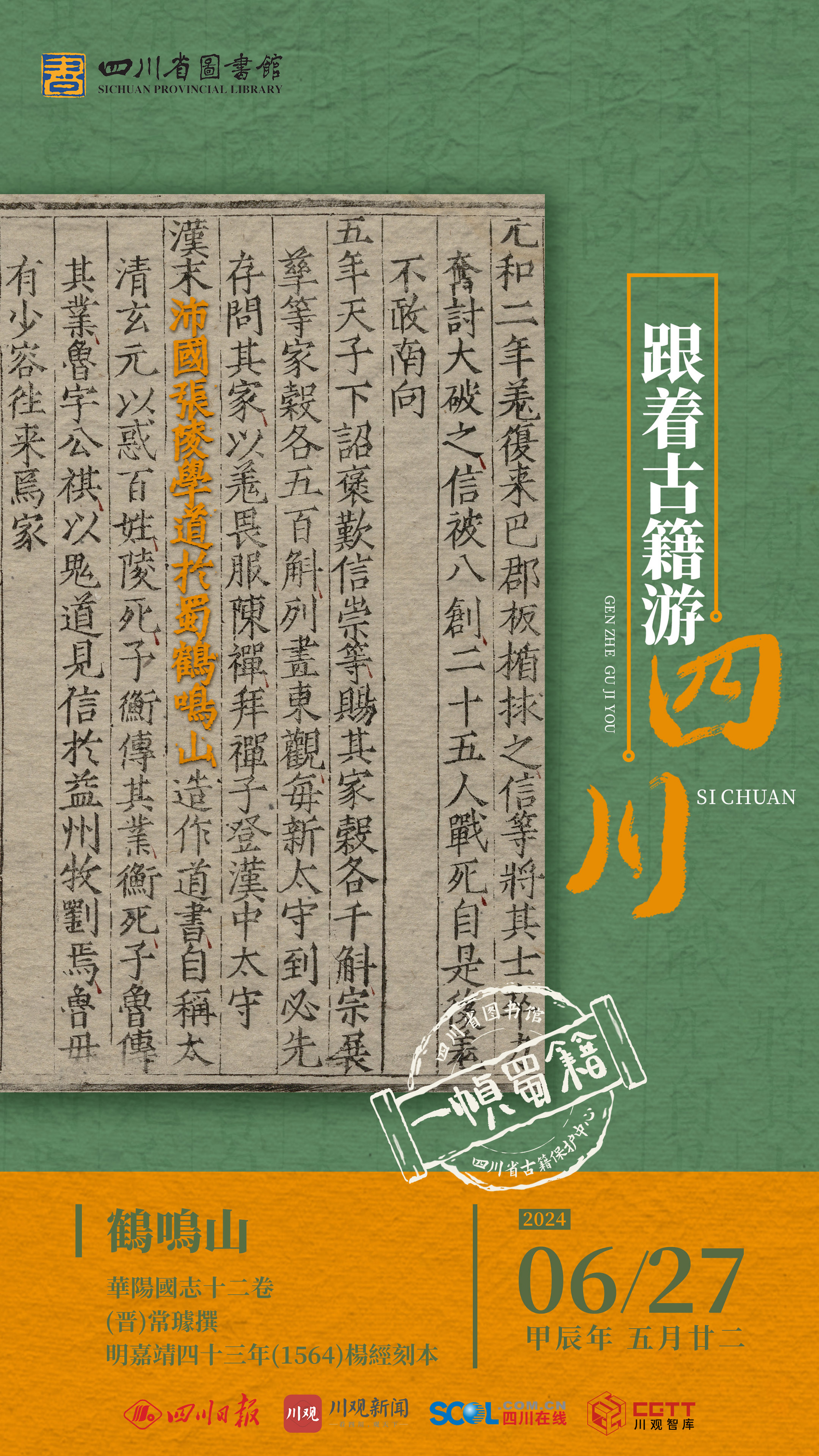 6月27日,一帧蜀籍带你云游鹤鸣山。海报图所选用的版本为《华阳国志》十二卷,(晋)常璩撰,明嘉靖四十三年(公元1564年)杨经刻本。