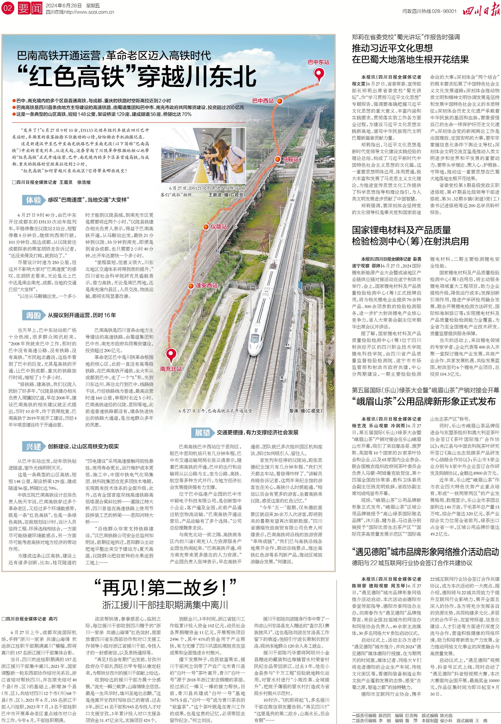 6月27日9时10分,巴南高铁正式开通运营。这是巴中、南充境内多区县首通高铁,巴中至南充的最短运行时间缩短至48分钟,至成都和重庆的运行时间都缩短了一个多小时。同时,巴南高铁将沿线的旅游资源“串珠成链”。关注今日二版,感受“巴南速度”。