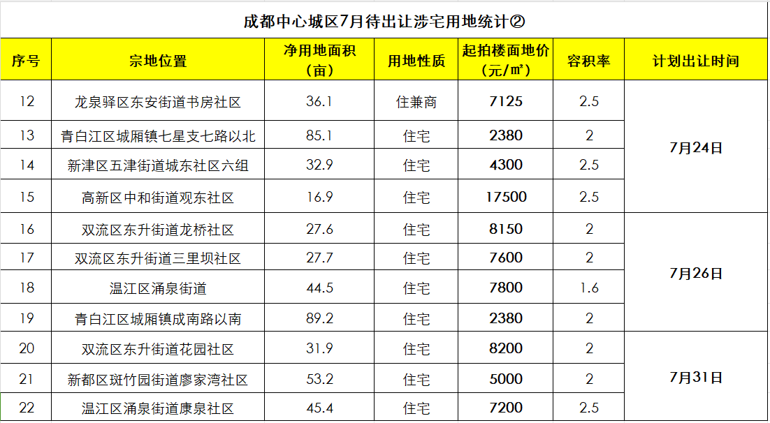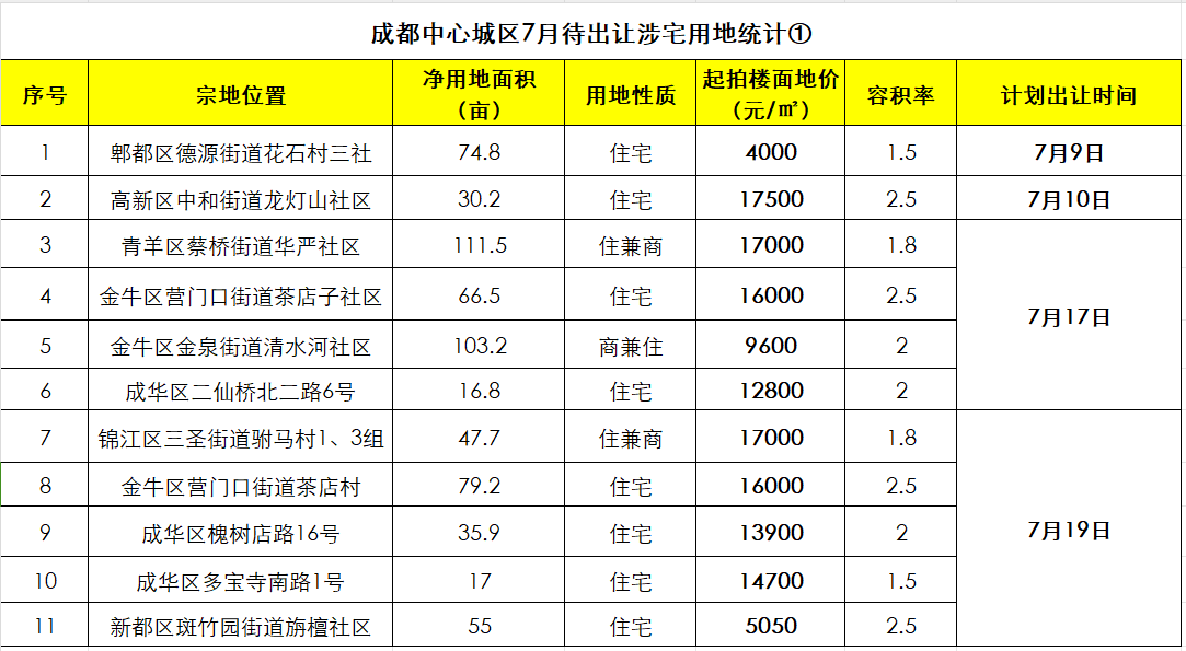 成都7月拟出让涉宅用地(截至6月28日)