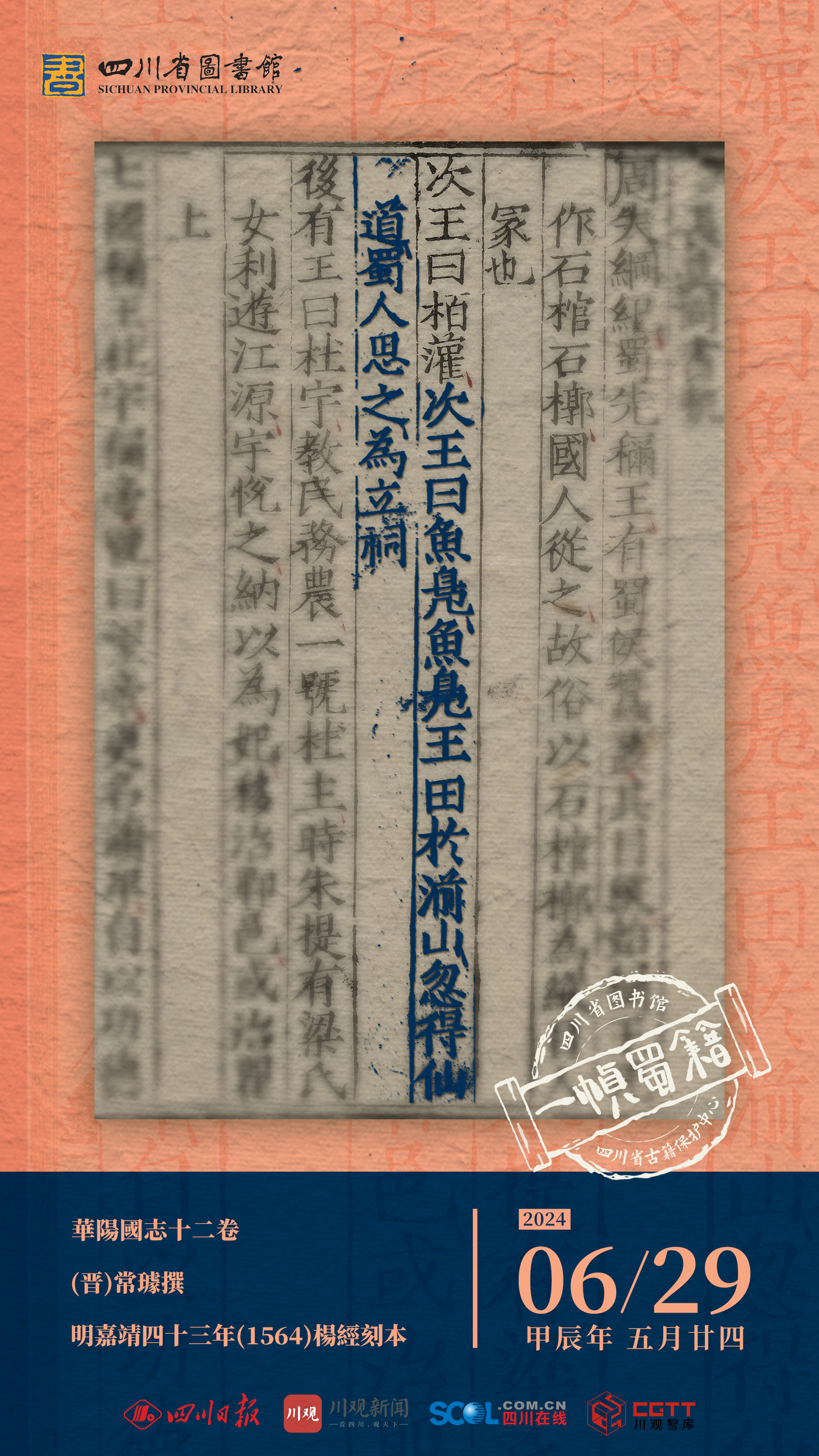 6月29日,一帧蜀籍带你走进鱼凫古城,海报图所选用的版本为《华阳国志》十二卷,(晋)常璩撰,明嘉靖四十三年(公元1564年)杨经刻本。