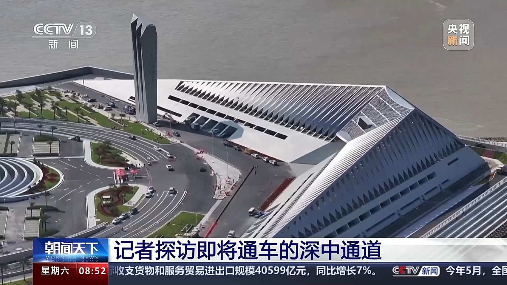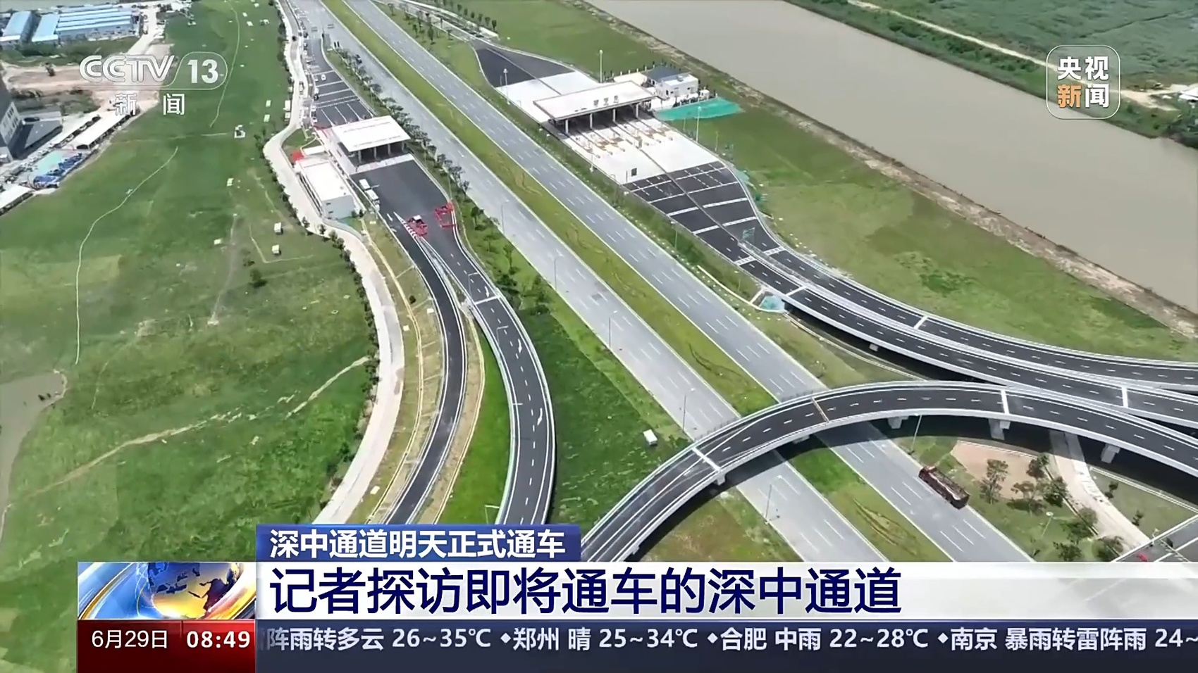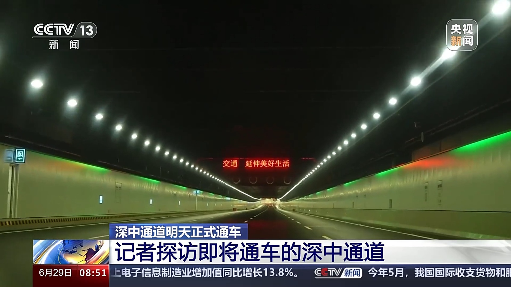 总台记者 王思元:深中通道全长24公里,我们行驶了大概18分钟,就已经通过海底隧道进入了深圳。这里是重要的互联互通的交通枢纽,我身后就是广深沿江高速,通过我的另一侧,大家可以看到,从这里行驶5公里左右,就可以到达机荷高速和广深高速了,从这个位置到达深圳宝安国际机场有2公里的距离。