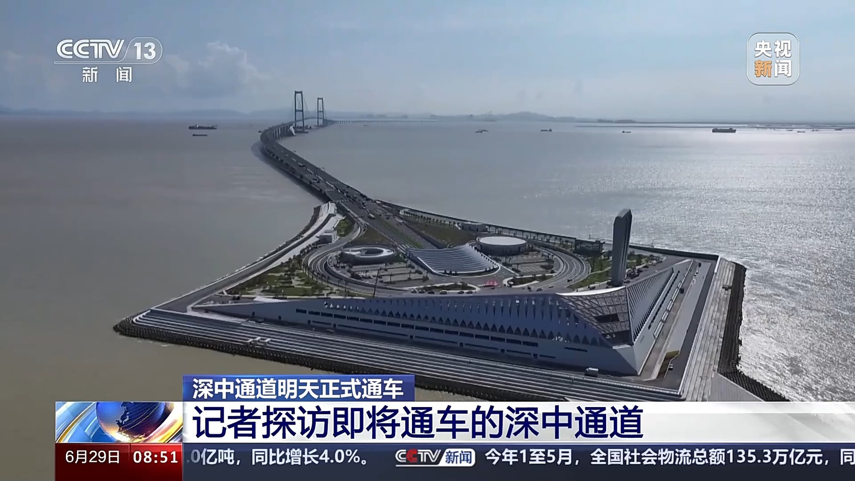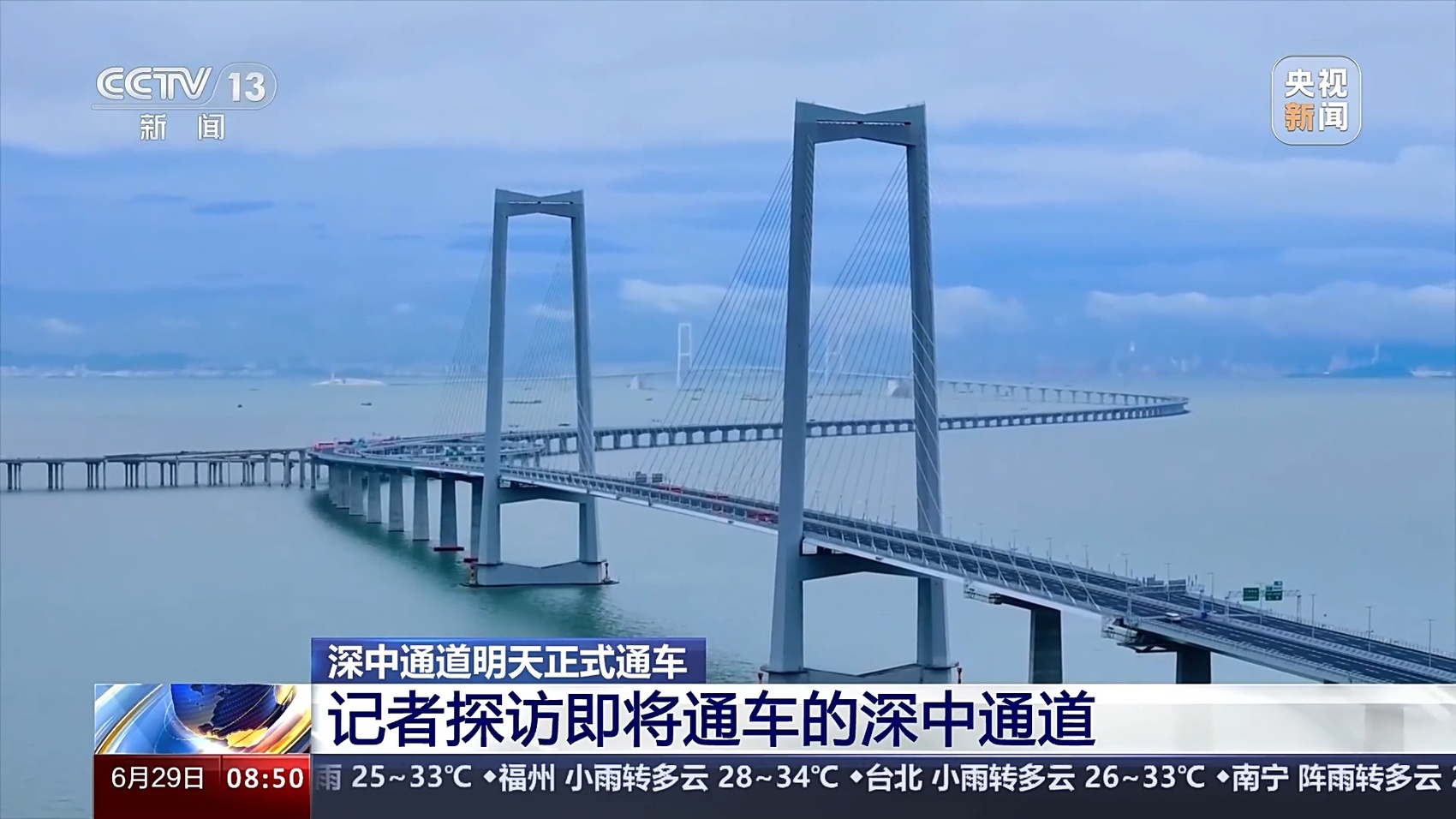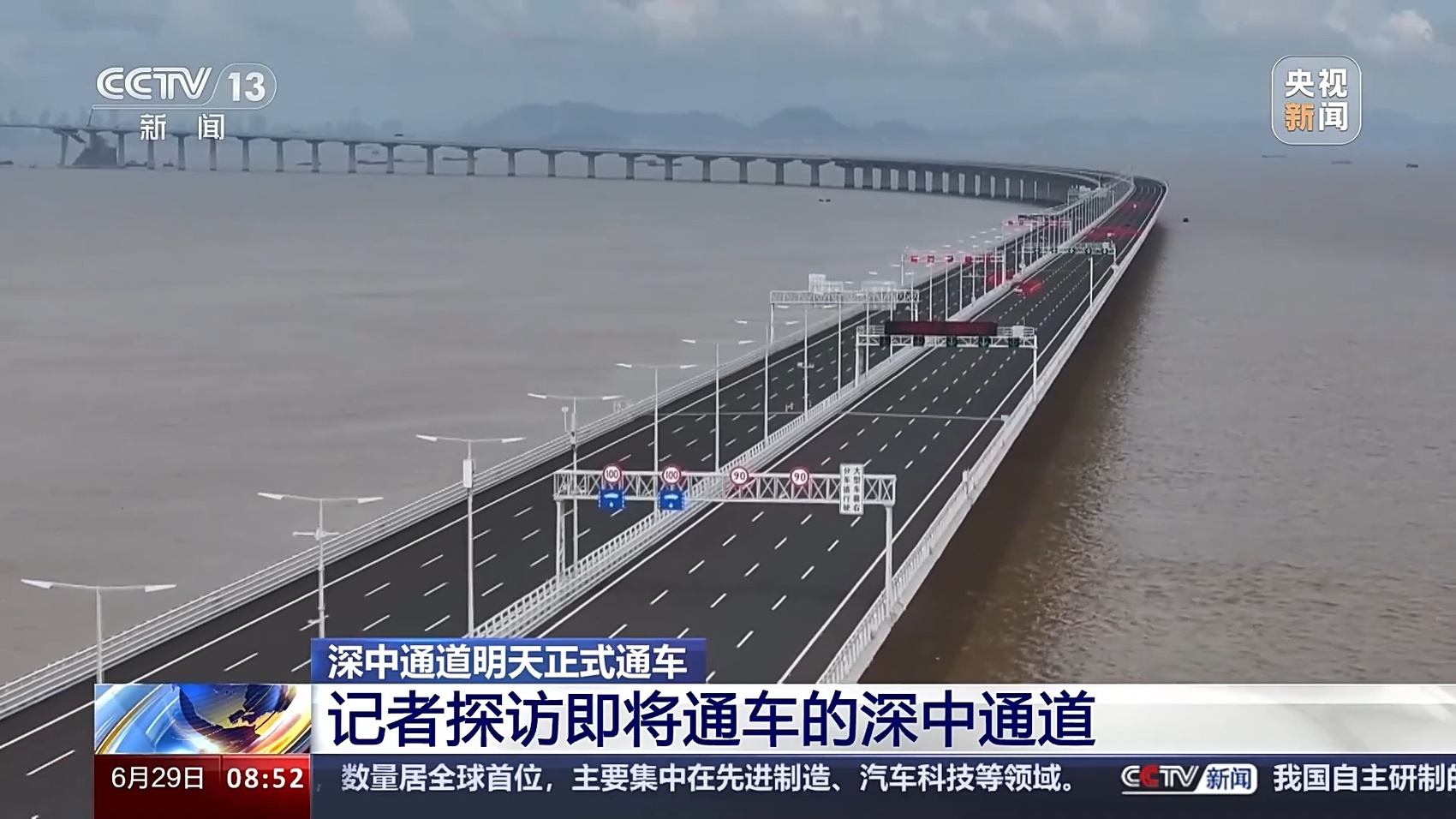 总台记者 王思元:现在我们就已经行驶到了深中通道的一个制高点的位置,这个位置离伶仃洋的海面有91米高。也就是相当于30层楼的这个高度,大家可以看一下海面。