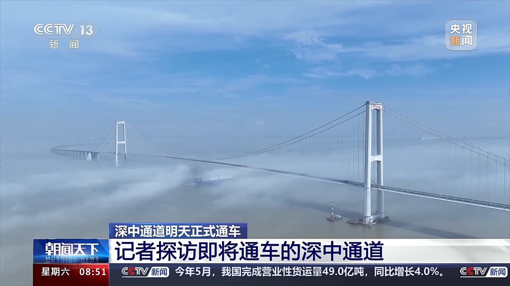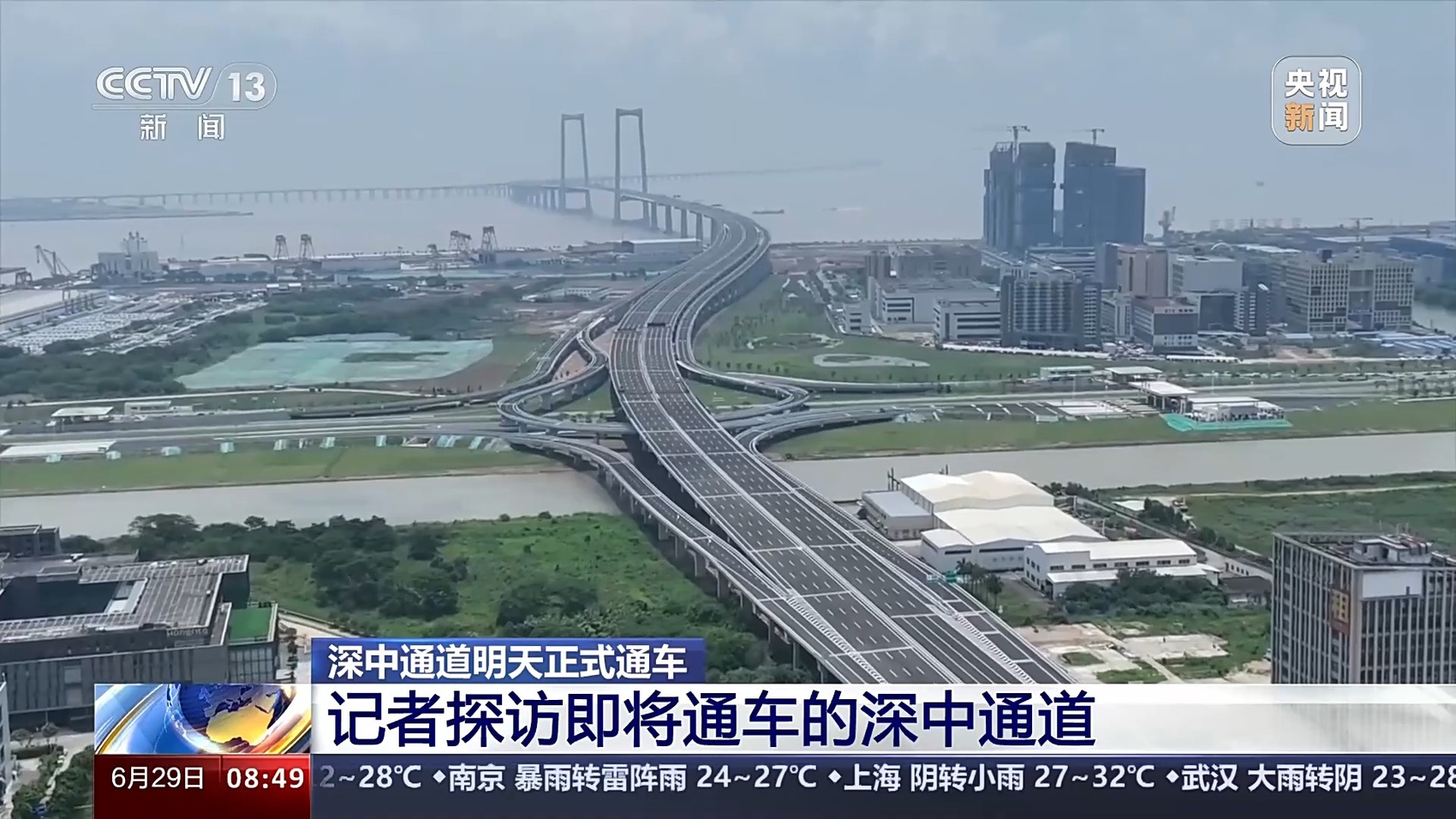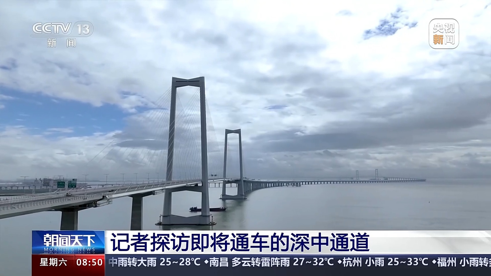 总台记者 王思元:现在我们就已经行驶到了深中通道的一个制高点的位置,这个位置离伶仃洋的海面有91米高。也就是相当于30层楼的这个高度,大家可以看一下海面。