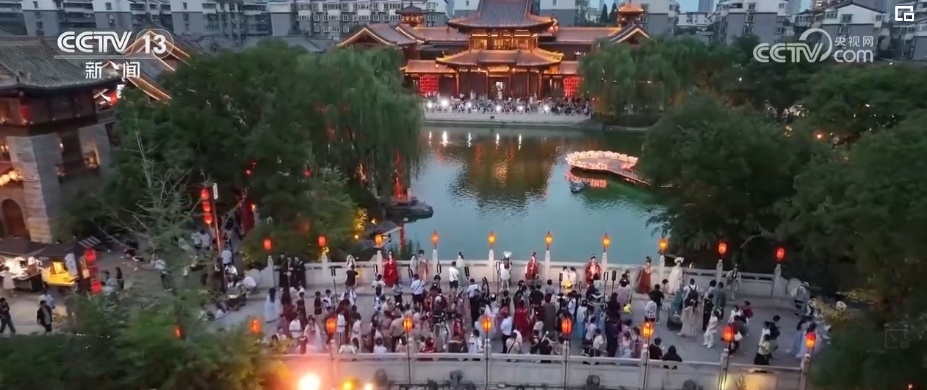 着华服、绾青丝、点朱丹……夜幕降临,新潭遗址之上建起的洛邑古城内人头攒动。精心妆造过的古装佳人或倚窗凝思,或凭栏望月,置身其中,仿佛穿越时空,美不胜收。