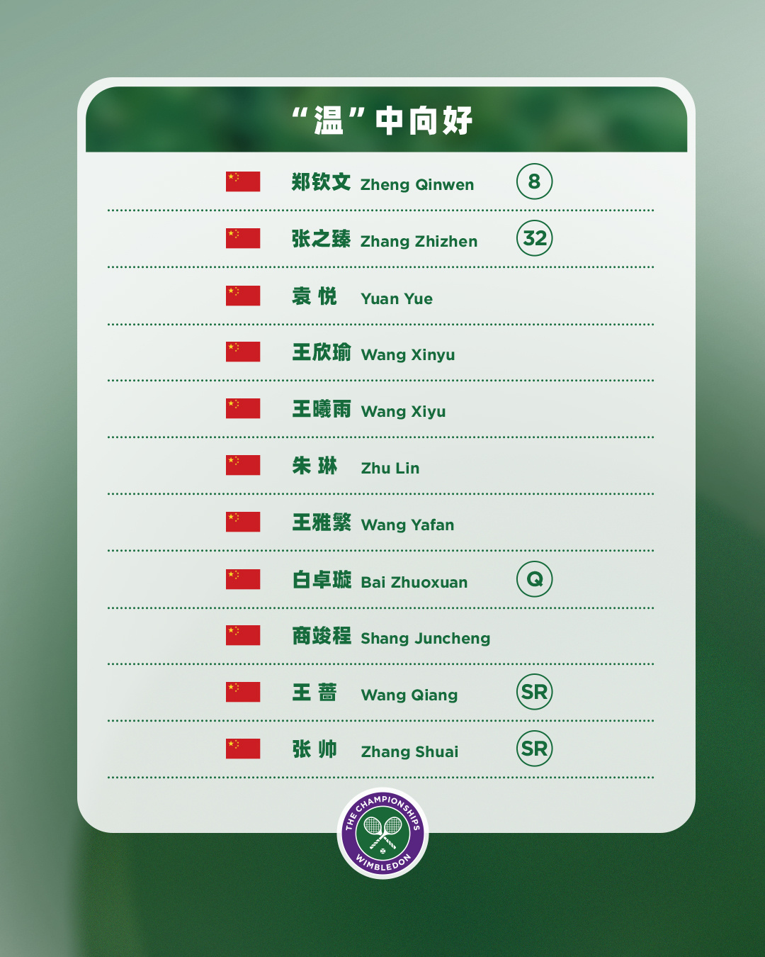 今年温网,中国网协旗下单打正赛参赛人数达到大满贯历史之最——11人,超越了年初在澳网创造的10人出战大满贯单打正赛的纪录。这11人分别是女单的郑钦文、袁悦、王欣瑜、朱琳、王曦雨、王雅繁、张帅、王蔷、白卓璇,以及男单的张之臻、商竣程。