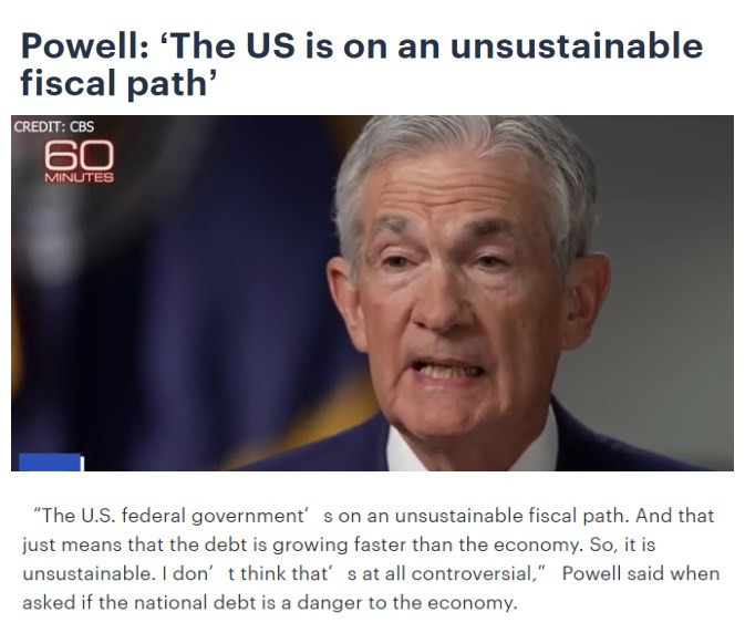 就连美联储主席鲍威尔此前在接受采访时也承认,美国债务增长速度快于经济增长速度,这是不可持续的。