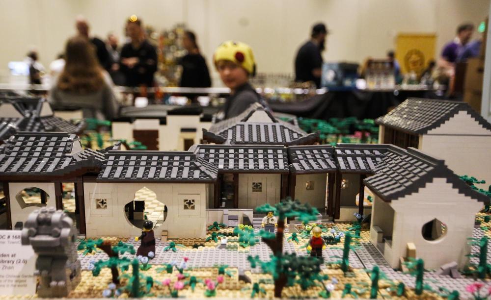 2020年1月12日,在美国洛杉矶,一名小观众在乐高玩具展上观看用乐高积木搭建的“中式园林”。新华社记者李颖摄