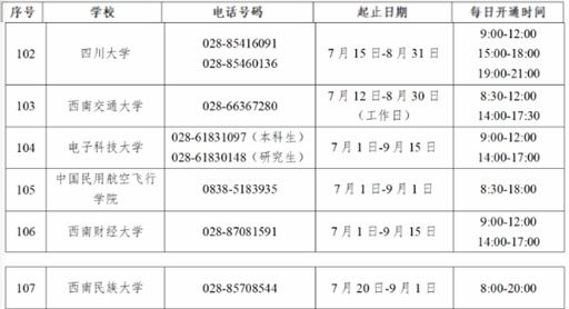 据悉,今年暑期,教育部将继续开通高校学生资助热线电话,号码为010—66097980、010—66096590,受理时间为7月1日—9月15日,每天8:00—20:00,为大学新生特别是家庭经济困难的大学新生提供资助政策咨询与帮助。涉及四川的资助电话信息具体如下表: