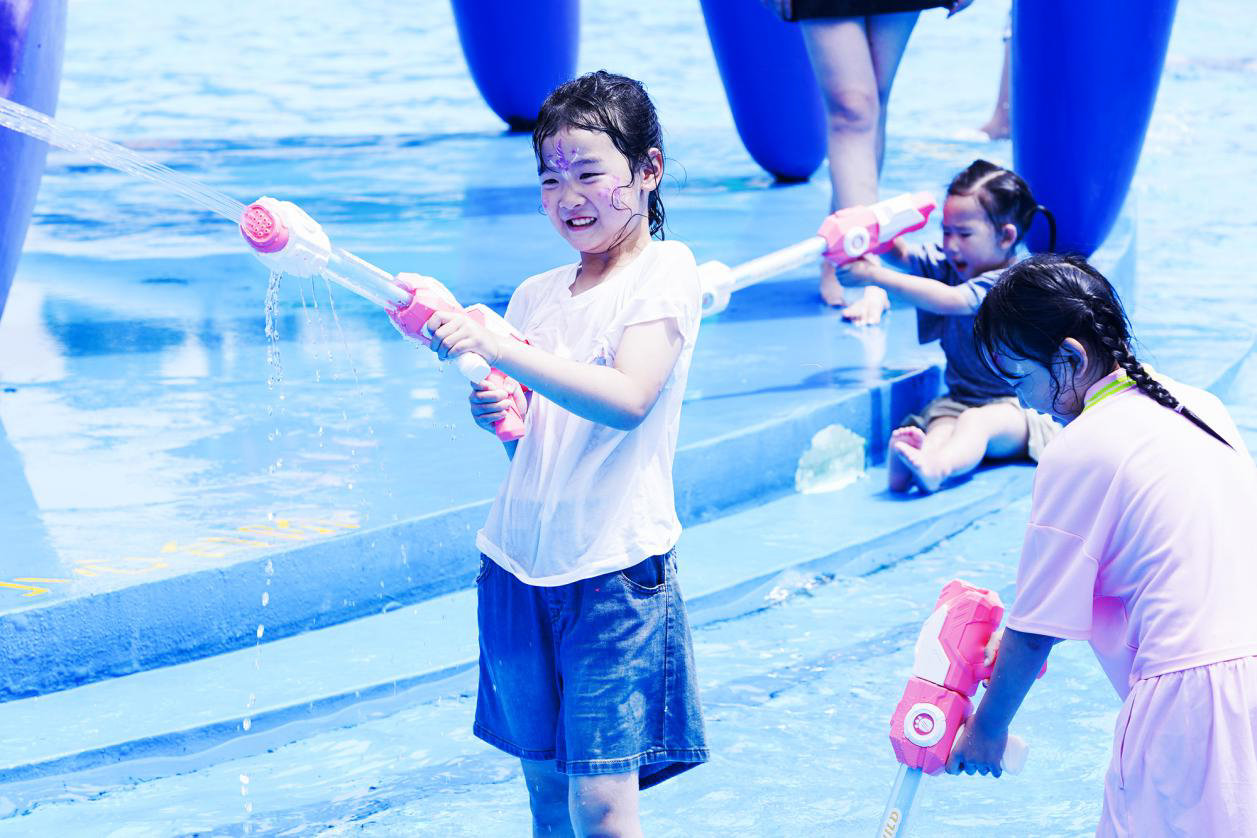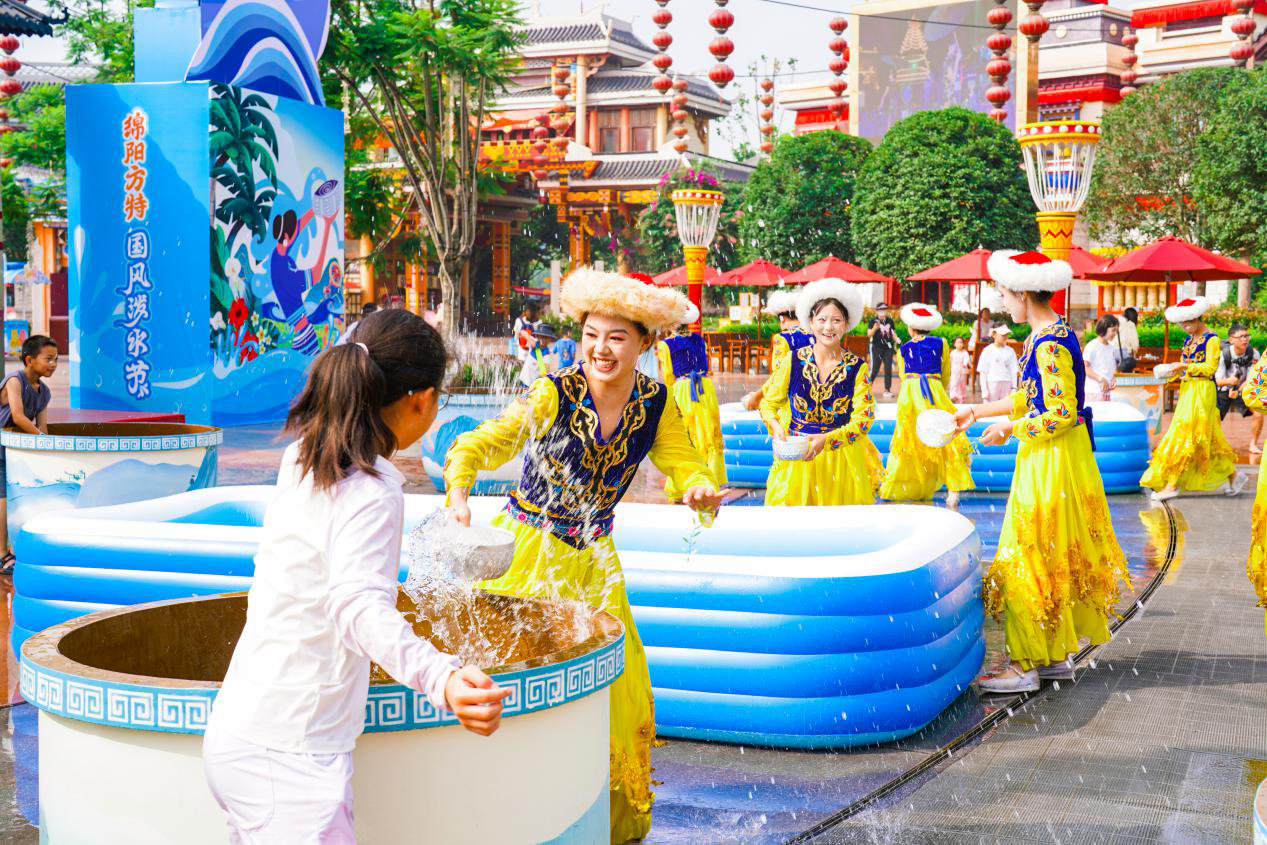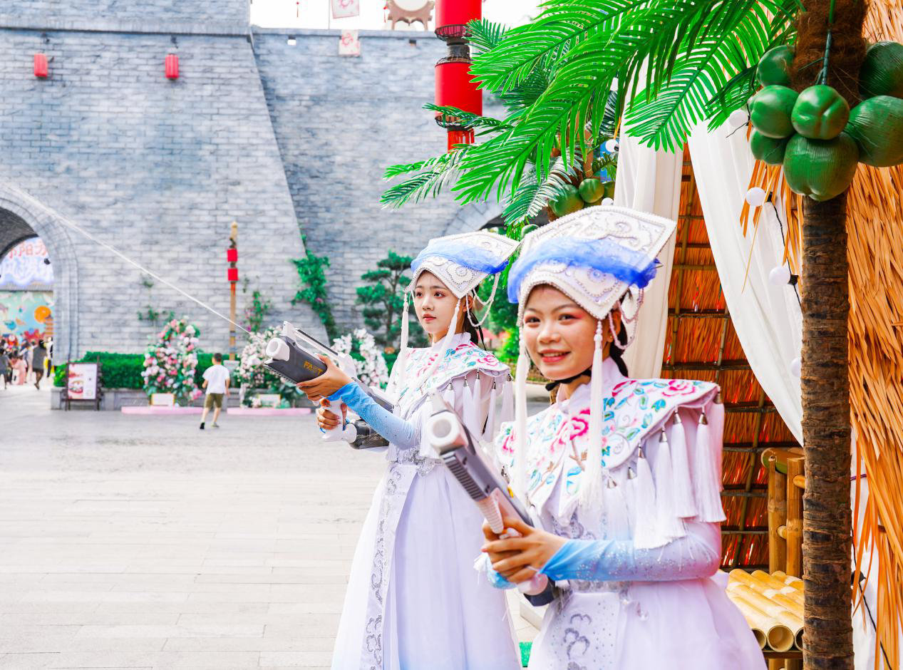 更具“清凉感”的体验还有花样繁多的泼水互动。在节庆广场,你可以和身着民族服饰的演员手拉手,在水花的点缀下跳民族舞;在《梦幻水世界》项目中,你可以换上泳衣,拿起水枪,在电音DJ的伴奏下来为一场独属于夏日的“互呲”战斗……