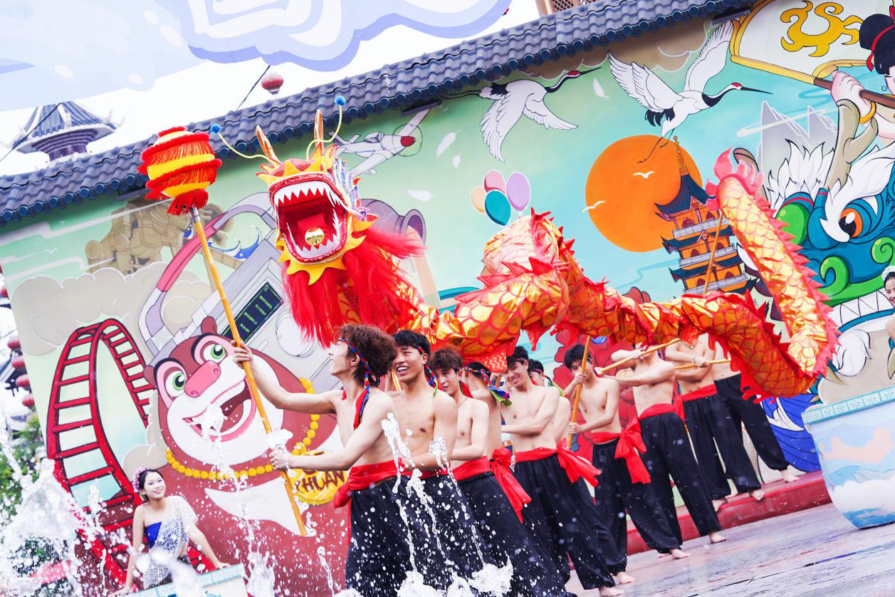 值得一提的是,绵阳方特的“国风泼水节”还推出了将泼水和舞龙融为一体的“水龙大秀”主题表演,为观众带来不一样的新奇游玩体验。