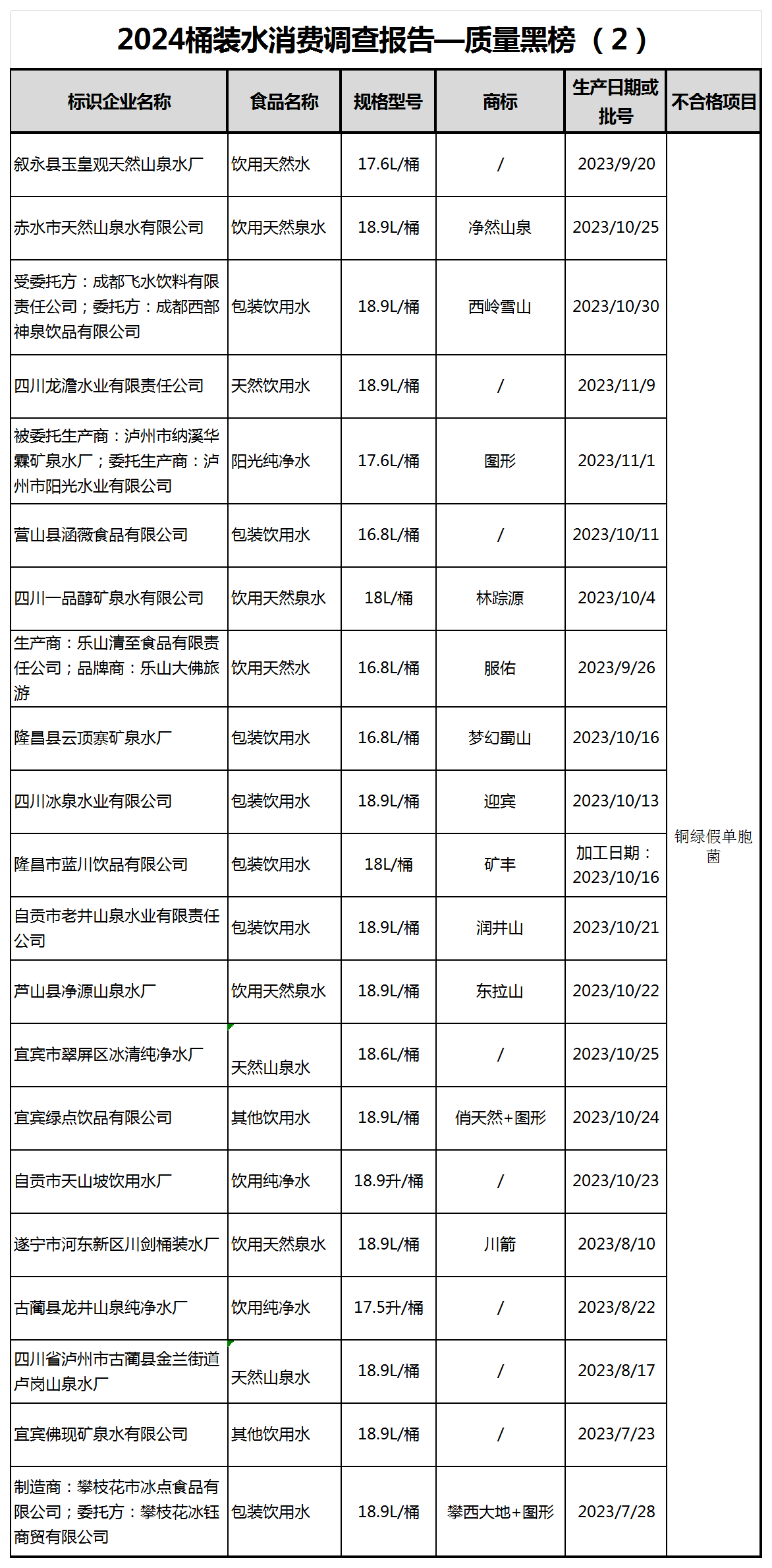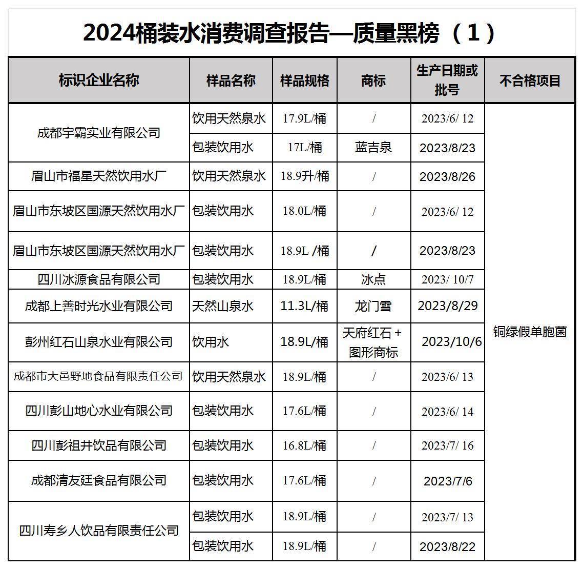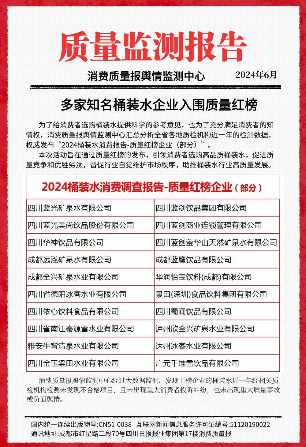 消费质量报舆情监测中心经过大数据监测,发现质量红榜入围企业如四川蓝光矿泉水有限公司、四川蓝剑饮品集团有限公司、成都全兴矿泉水业有限公司等大品牌企业的桶装水在近一年经相关质检机构检测未发现有不合格项目,且未出现重大消费者投诉纠纷,也未出现重大质量事故或负面舆情。