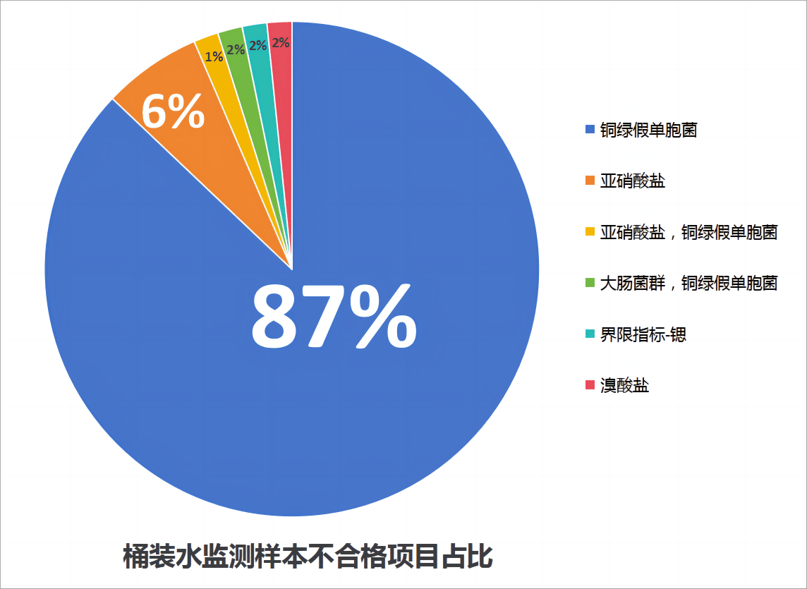 消费质量报舆情监测中心汇总近一年桶装水监测数据,发现不合格桶装水的不合格项目一般为:铜绿假单胞菌、亚硝酸盐、大肠菌群、界限指标、溴酸盐等,其中尤以铜绿假单胞菌问题最为严重,在不合格桶装水监测样本中,因铜绿假单胞菌检测不合格的桶装水,其占比达到87%。