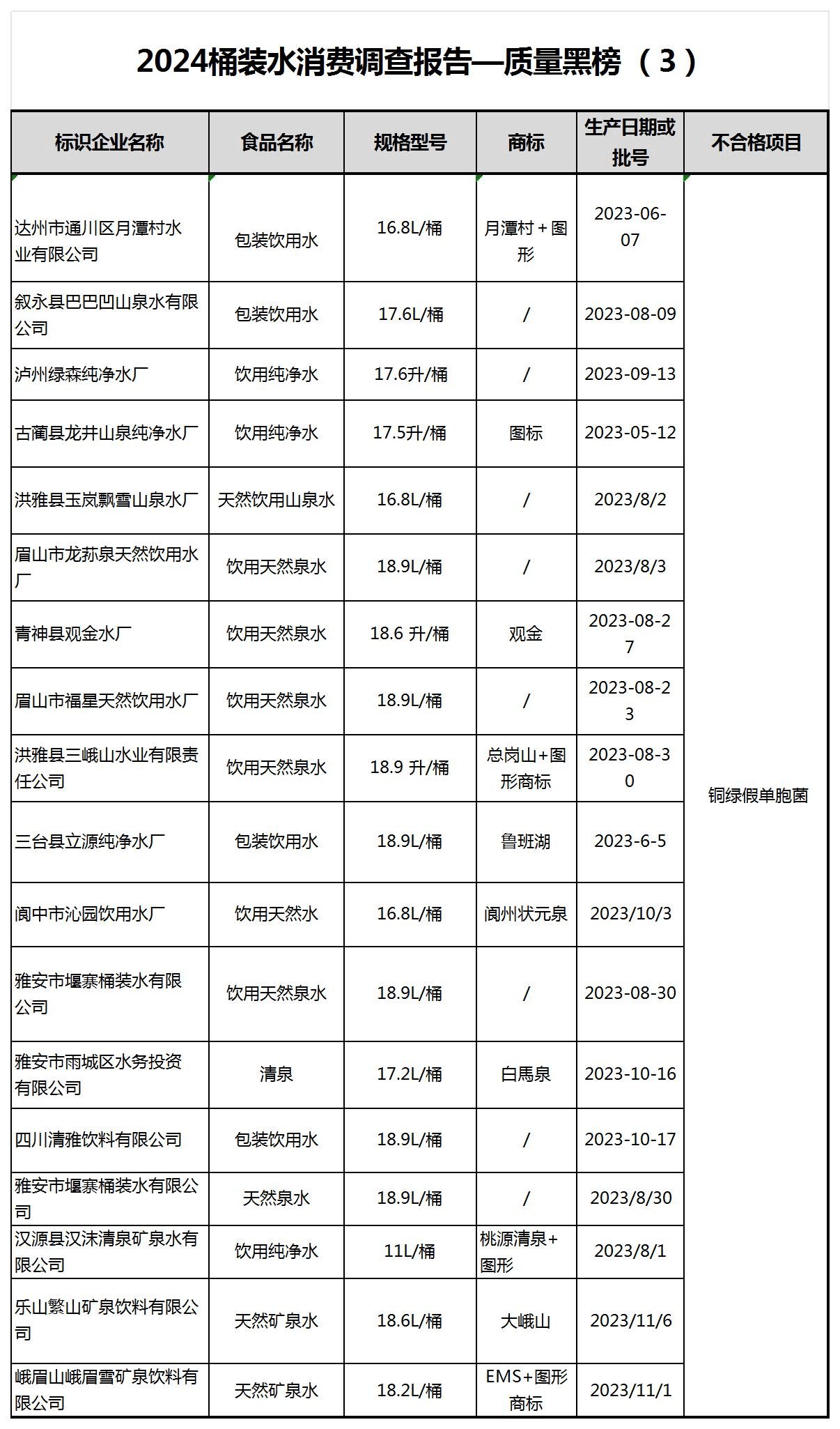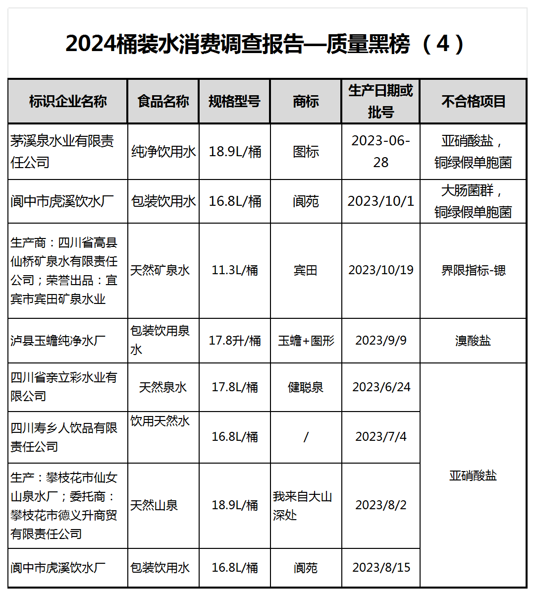 哪些桶装水有质量问题呢?为了给消费者选购桶装水提供科学的参考意见,也为了促进质量竞争和优胜劣汰,督促行业自觉维护市场秩序,助推桶装水行业高质量发展,消费质量报舆情监测中心汇总分析全省各地质检机构近一年的检测数据,权威发布“2024桶装水消费报告-质量黑榜”(部分)。企业上榜原因是企业有桶装水在近一年左右经相关质检机构检测发现有不合格项目。
