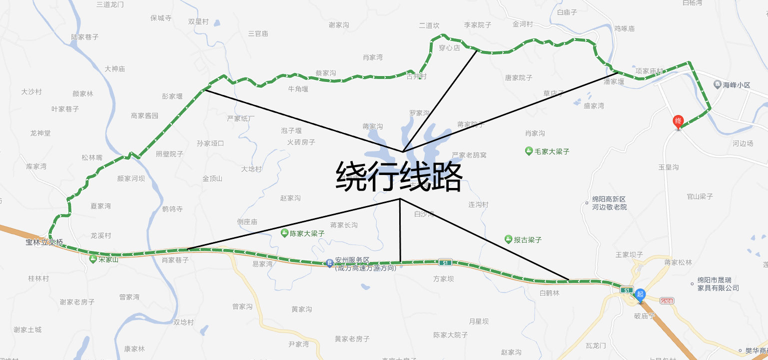 1、封闭成绵向高新区收费站下行匝道:经高新区收费站下站车辆行驶至S1成万高速磨家互通枢纽-—G5京昆高速—绵阳南收费站下站绕行,绕行路线如图: