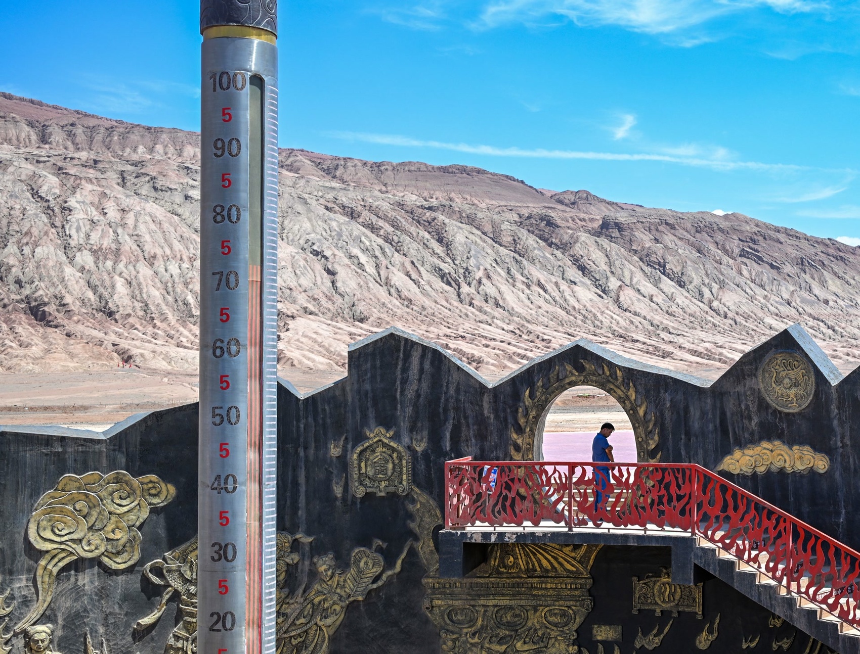 2024年6月29日,新疆吐鲁番火焰山景区的巨型温度计,当日该温度计所示地表温度超过70摄氏度。新华社记者 陈朔 摄