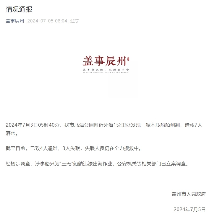 7月5日,辽宁盖州市人民政府发布情况通报:2024年7月3日5时40分,盖州市北海公园附近外海1公里处发现一艘木质船舶侧翻,造成7人落水。