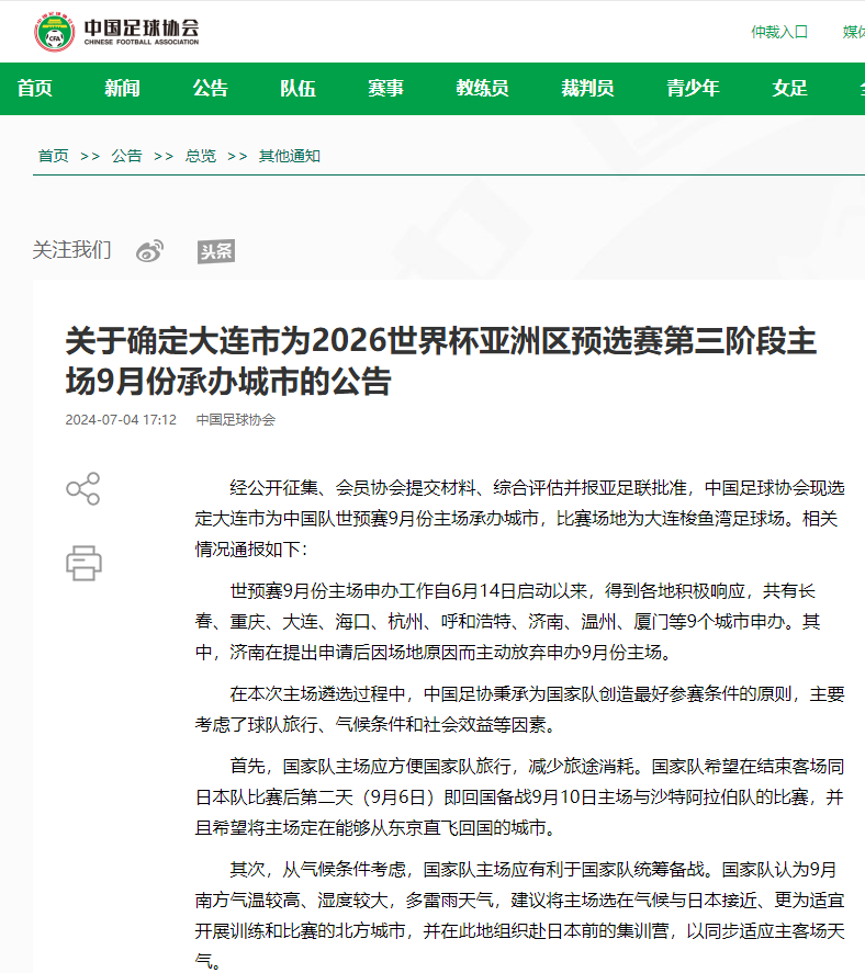 随着2026年世界杯亚洲区预选赛18强赛分组抽签结果的揭晓,中国男足也正式开启了备战2026年世界杯亚洲区预选赛18强赛的大幕。7月4日,中国足协在其官方网站发布公告,宣布大连成为2026年世界杯亚洲区预选赛18强赛中国男足主场与沙特阿拉伯队比赛的举办地,同时,中国足协调整了2024赛季中超联赛的赛程,为中国男足争取了更多的集训时间。