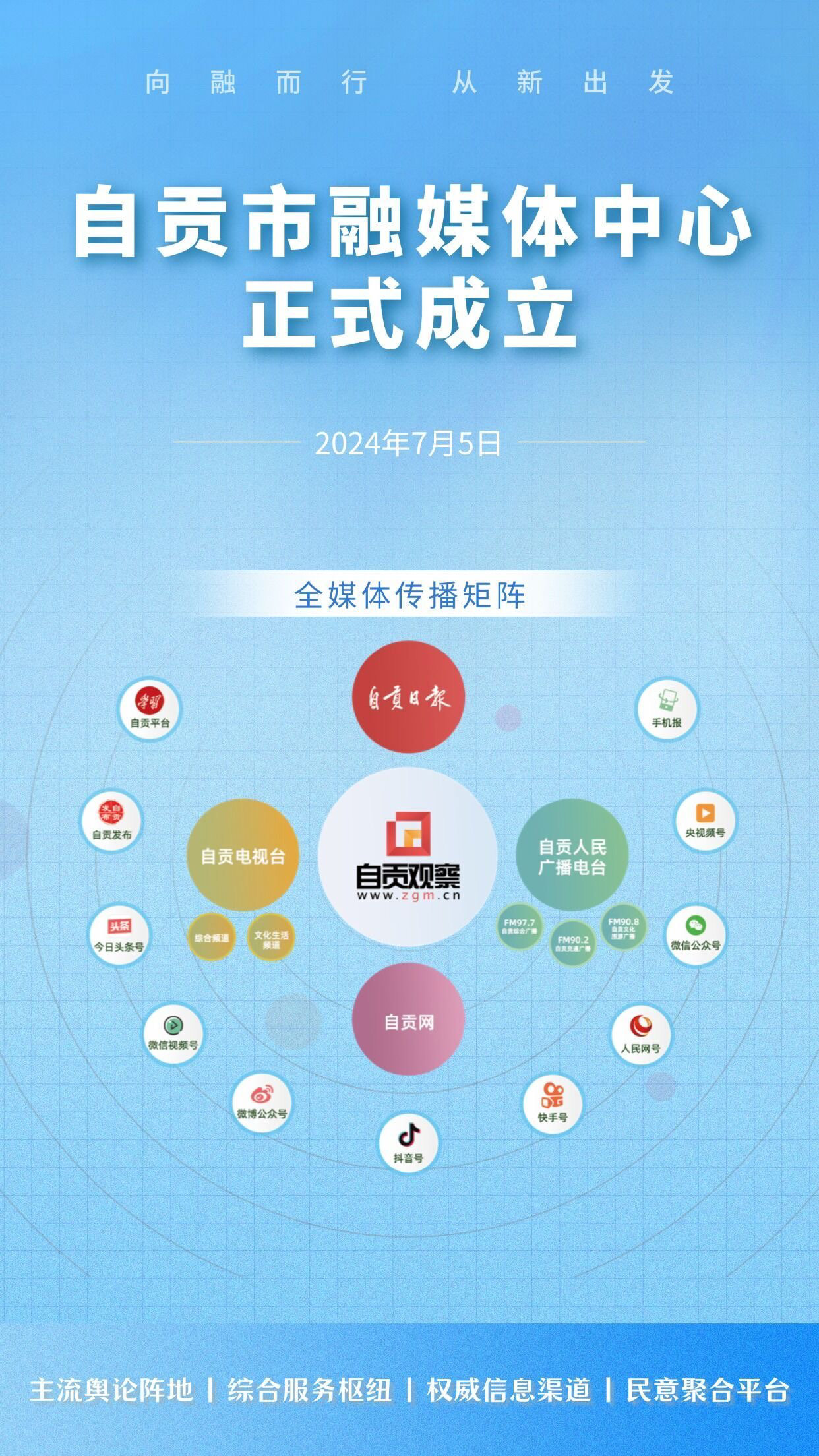 全新的自贡市融媒体中心,拥有新媒体、报纸、广播和电视聚合成的全媒体传播平台。包括《自贡日报》、自贡广播电台三个广播频率、自贡电视台两个电视频道等传统媒体平台,以及“自贡网”“自贡观察”客户端等新媒体平台和头条号、微信公众号等三方新媒体账号。其客户端下载量、注册用户、日活率等综合指标均位居全省前列,现已形成以移动客户端为核心平台,报纸、广播、电视、网站、手机报、微信公众号、微博、抖音、今日头条等为延伸的全媒体传播矩阵。