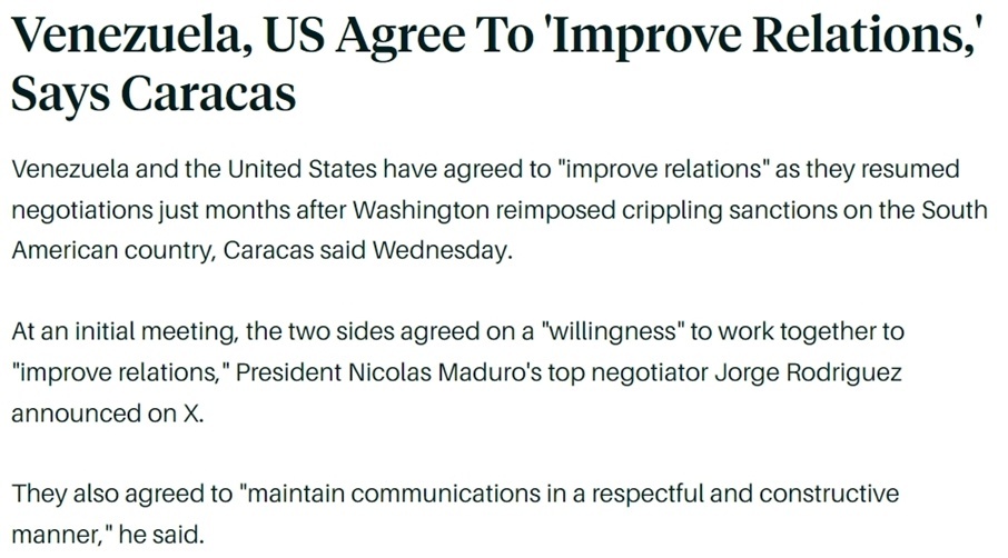 当天下午,负责与美国谈判的委内瑞拉全国代表大会主席、执政党统一社会主义党政治局成员罗德里格斯在社交媒体上表示,与美国的线上直接对话结束,双方就改善关系达成共识:第一,两国政府愿意共同努力,赢得信任并改善关系;第二,双方以尊重和建设性的方式保持沟通。