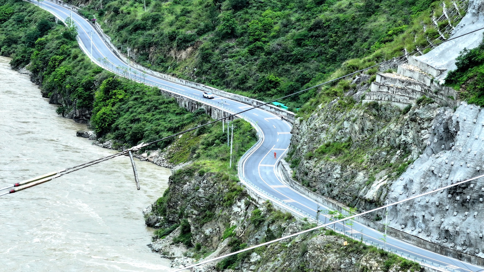 金上至湖北特高压直流工程川10标段正在飞越大渡河,图为同步跨越导线下方的省道。刘湘钒 摄