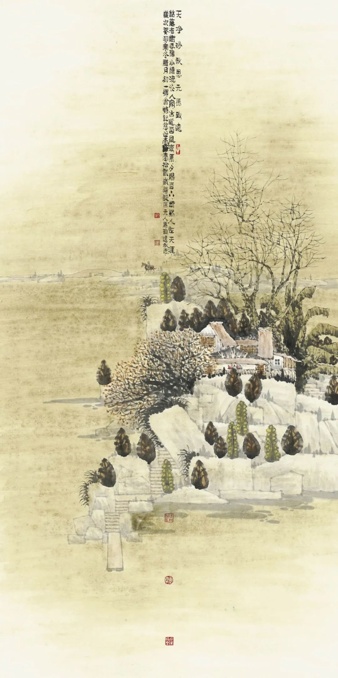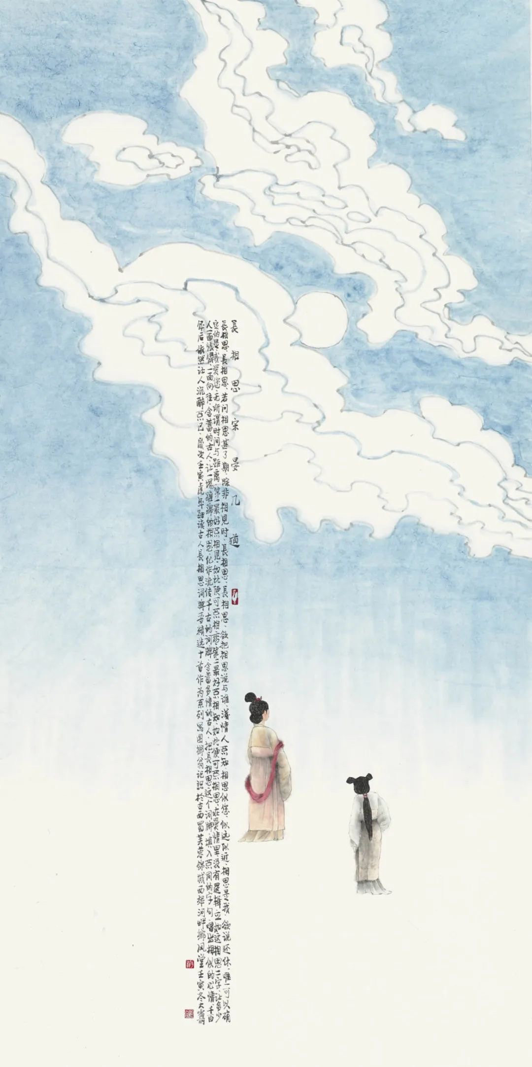 中国山水画与中国诗歌相伴相生,是一种独具中国气质的艺术形式。苏东坡有言“味摩诘之诗,诗中有画;观摩诘之画,画中有诗”,虽非特为评山水画而言,却正道出了中国文士诗画一体的独特文艺观。此次展览展出的画作,就有不少灵感来源于中国古典诗歌佳作,例如晏几道的《长相思》、马致远的《天净沙·秋思》、周邦彦的《苏幕遮》、秦观的《满庭芳》、柳永的《雨霖铃》等。