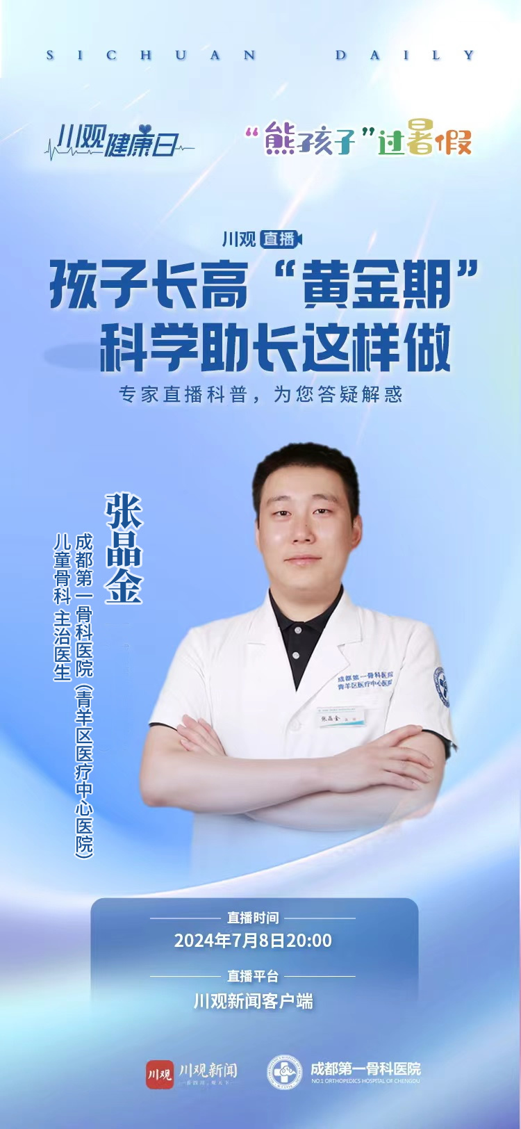 7月8日,川观新闻携手成都第一骨科医院/青羊区医疗中心医院开展健康科普直播,邀请儿童骨科专家,为我们揭开“长高的奥秘”,就家长们关心的儿童身高管理,进行科普讲解,答疑解惑。