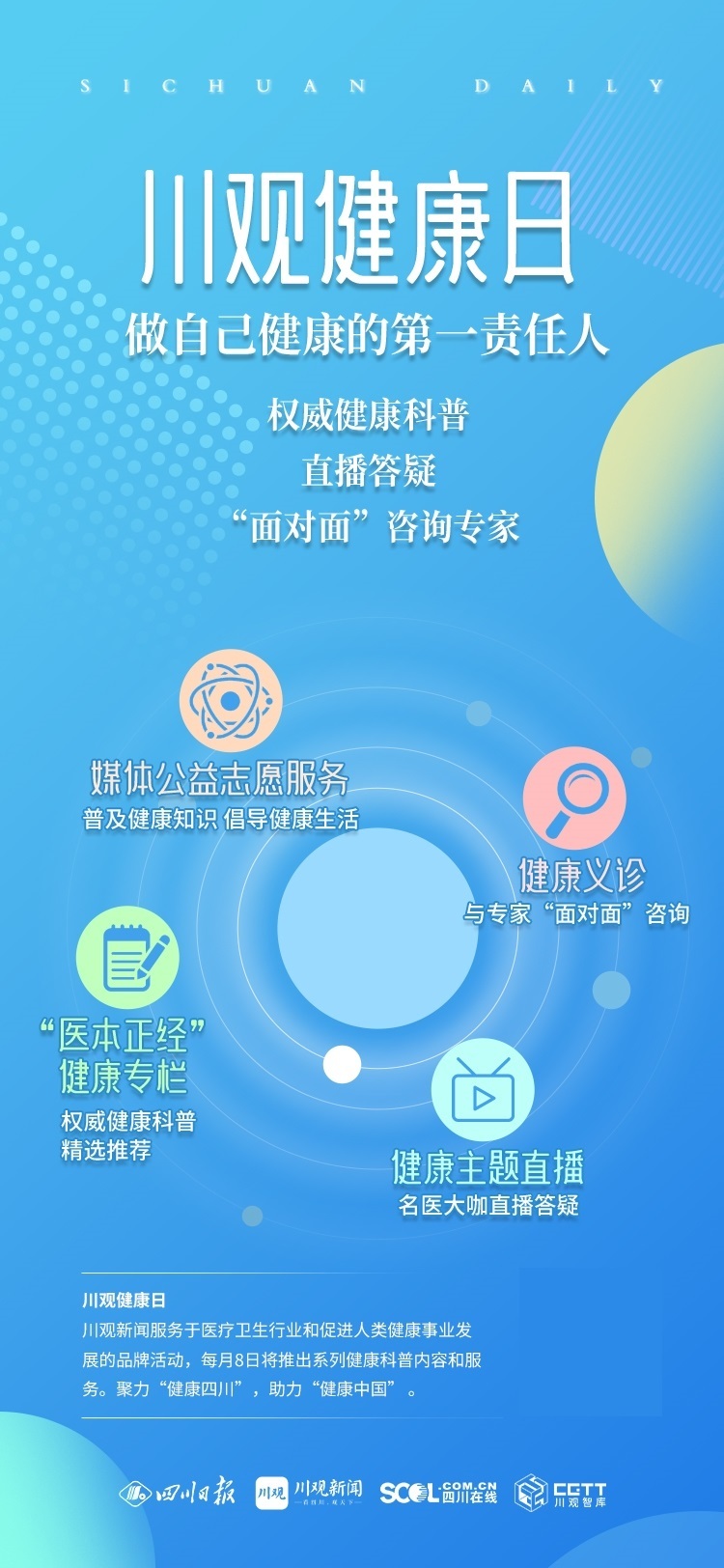 “川观健康日”是川观新闻服务于大众健康的品牌活动。每月8日为“川观健康日”,川观新闻将推出C视频《医本正经》健康科普专栏、健康主题直播、健康义诊等内容和服务。聚力“健康四川”,助力“健康中国” 。