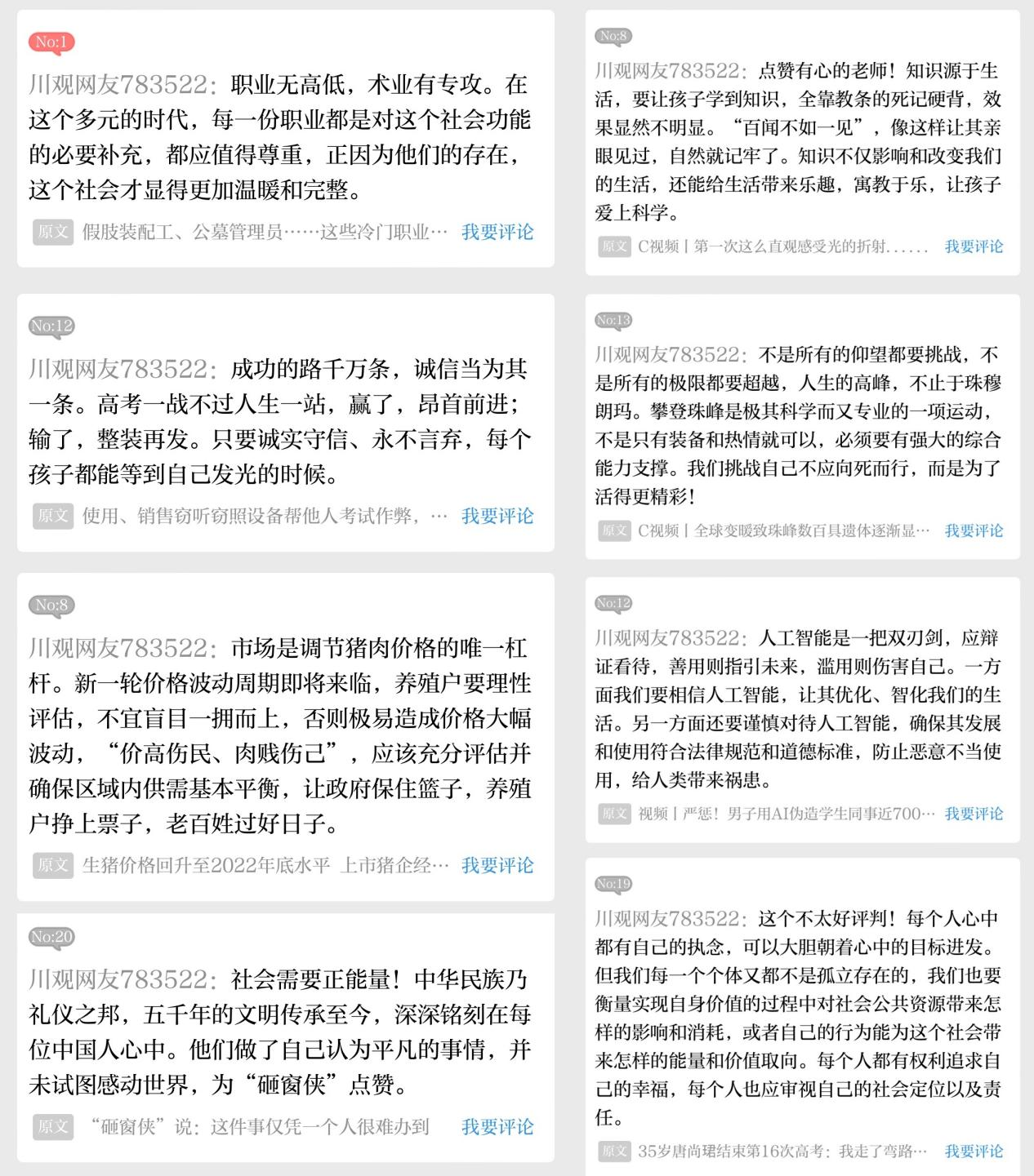 (“川观网友783522”每日悦评榜部分上榜评论)