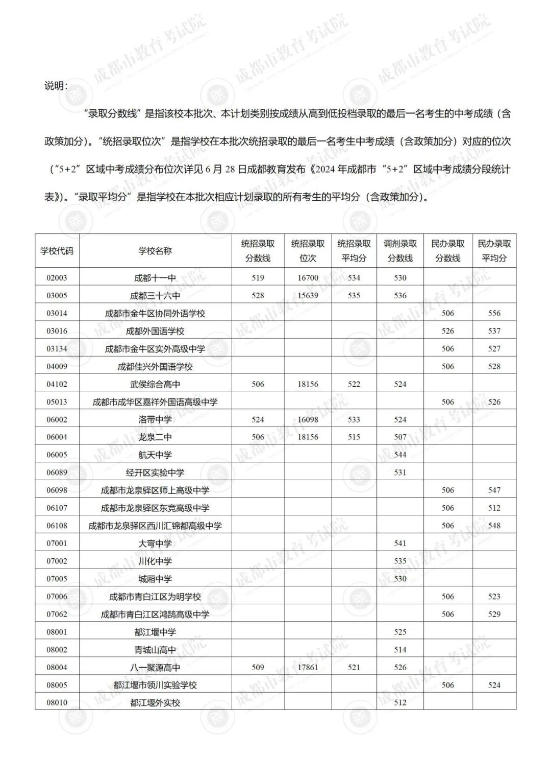 “统招录取位次”是指学校在本批次统招录取的最后一名考生中考成绩对应的位次(“5+2”区域中考成绩分布位次详见6月28日成都教育发布《2024年成都市“5+2”区域中考成绩分段统计表》)。