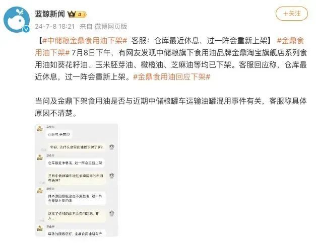 公开资料显示,中储粮旗下有金鼎、鼎皇、华鼎、俏厨等食用油品牌。7月8日下午,有网友发出截图称,金鼎官方旗舰店产品均下架,这一情况也被网友担忧称产品是否不安全。同日晚间,记者搜索发现,旗舰店产品均可正常购买,金鼎客服回应称,如果产品下架,代表当前产品已卖完售罄,金鼎食用油所有产品均符合国家有关食品安全标准。