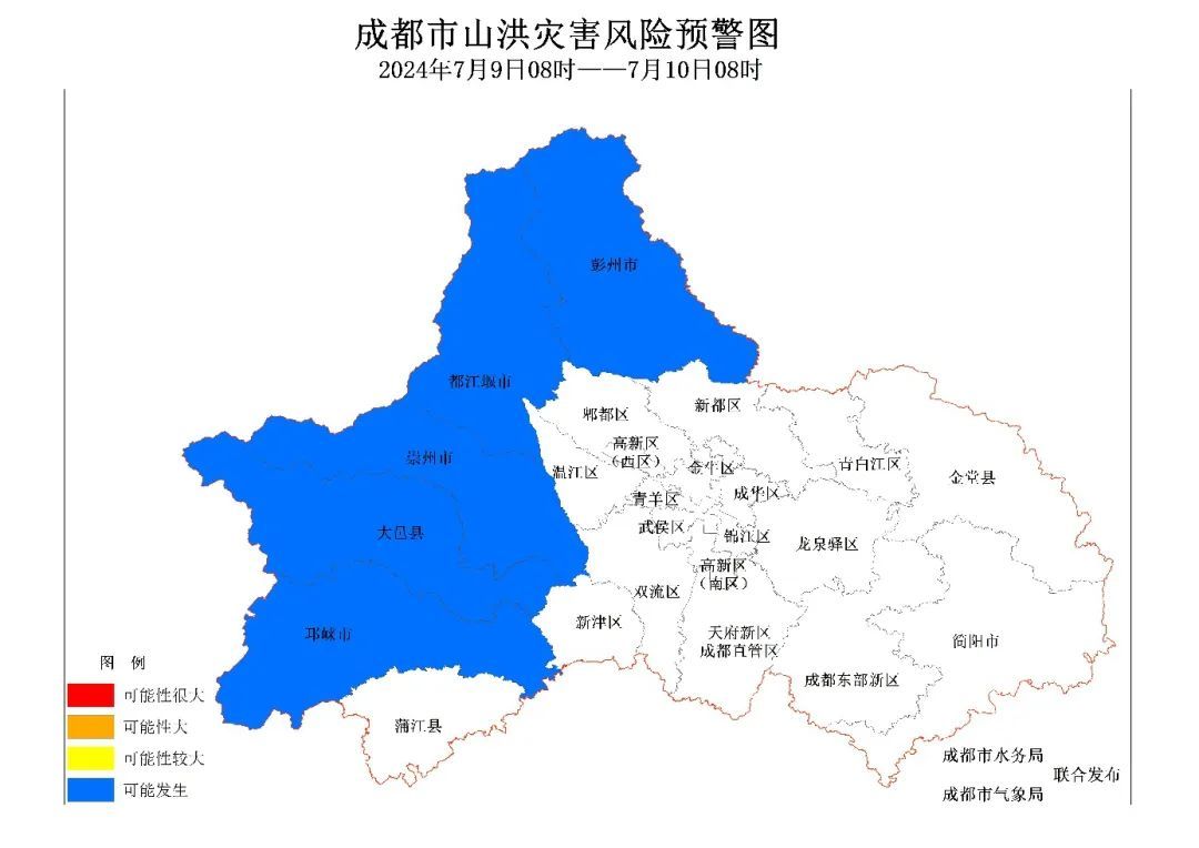 预警显示:2024年7月9日08时至10日08时,彭州市、都江堰市、崇州市、大邑县、邛崃市可能发生山洪灾害(蓝色)。