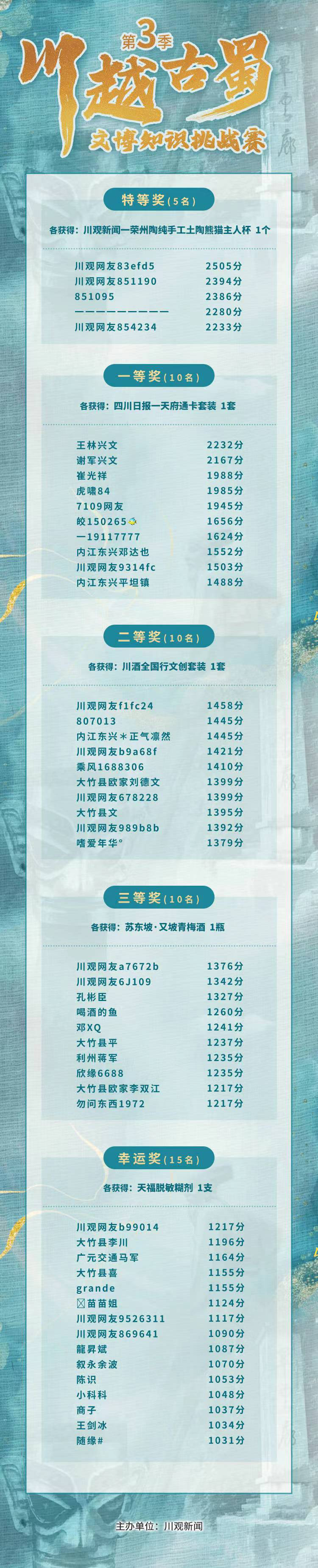 一首《成都》将玉林路“唱”遍大街小巷,“到成都的街头走一走”成为最潮的Citywalk,此次文博知识挑战赛圆满收官,答题收获满满,了解了更多的文博知识,期待下一季的活动更加精彩哟!有幸中奖这是对日常知识积累的肯定,又是一种鞭策!祝愿川观新闻的挑战赛办得更加精彩!快来巴蜀大地感受知识的魅力吧!
