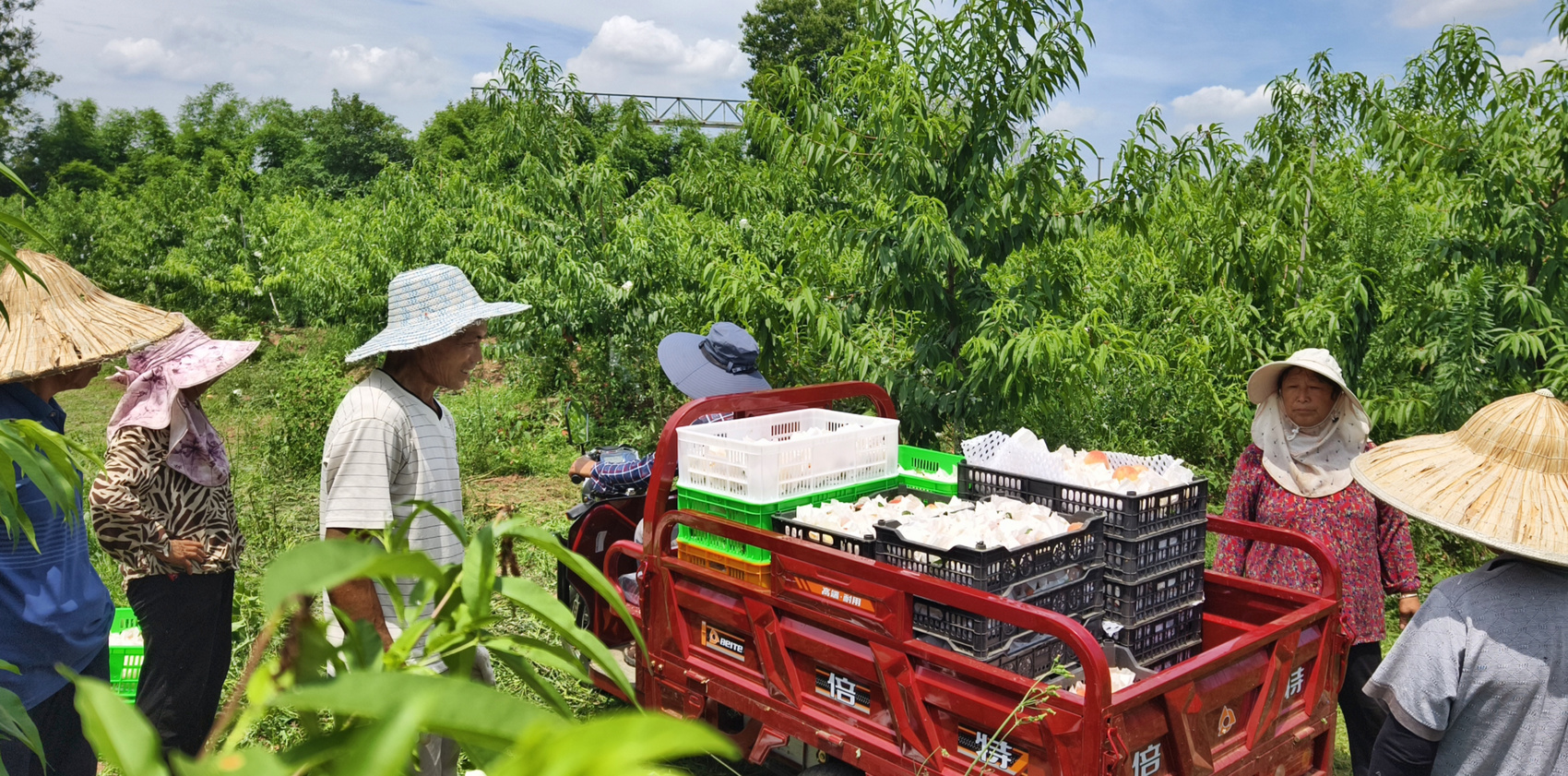 果农采摘下来的龙泉驿水蜜桃一筐筐运送至分拣中心。